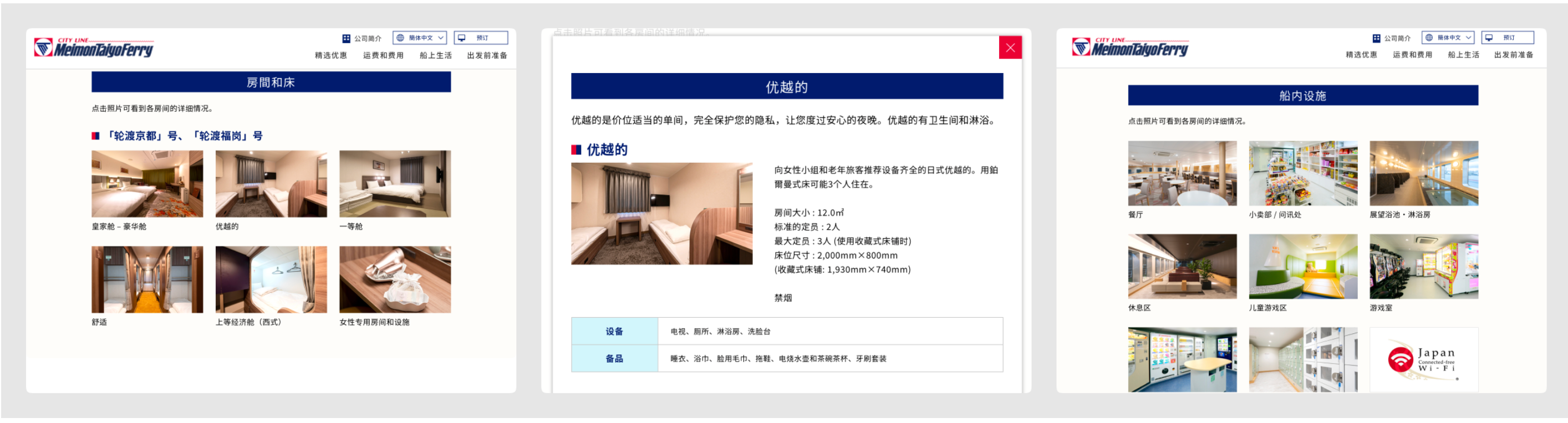 步驟1:打開官網(wǎng),到 [船上生活] 模塊查看有哪些船(只有兩艘)和房型,以及船上有哪些服務(wù)設(shè)施等。
