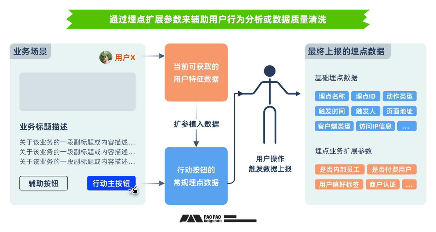 通常這些埋點會分為“頁面訪問(PV、UV)、區塊曝光(區域、時長)、按鈕操作(動作、狀態)”三大類型,并攜帶交互元素和操作者的各類特征信息參數,便于我們知曉更多的場景細節與用戶情況,例如知曉這個「免費試用」按鈕是對應了那個產品?點擊的用戶是否已開通這個產品?這個用戶是否為付費用戶?是否個人還是商家類型?用戶從哪個渠道進來的等,而且這些植入在產品代碼中的埋點可以不間斷持續的采集和配套產品迭代進行維護,可以幫助業務團隊獲取大量有效數據用作業務分析決策。