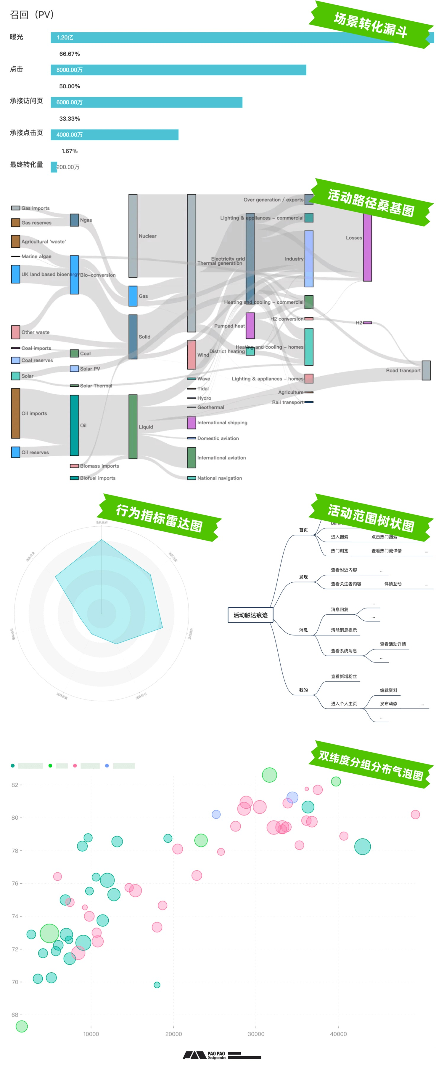 這些數據最終可能由可視化的數據報表呈現出來,以便于業務團隊快捷的找到數據問題或特征,如常見的漏斗圖、桑基圖、雷達圖、樹狀圖、散點圖、決策樹等;