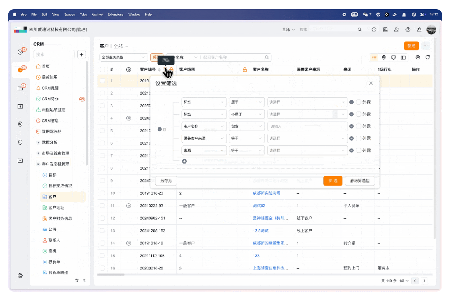 比如下面這三個篩選項,所計算的呈現(xiàn)規(guī)則就是 「銷售負(fù)責(zé)人是李強」且「銷售時間是 近一個月」且「價值為高價值」的客戶,這樣就是一個典型的且的關(guān)系。
