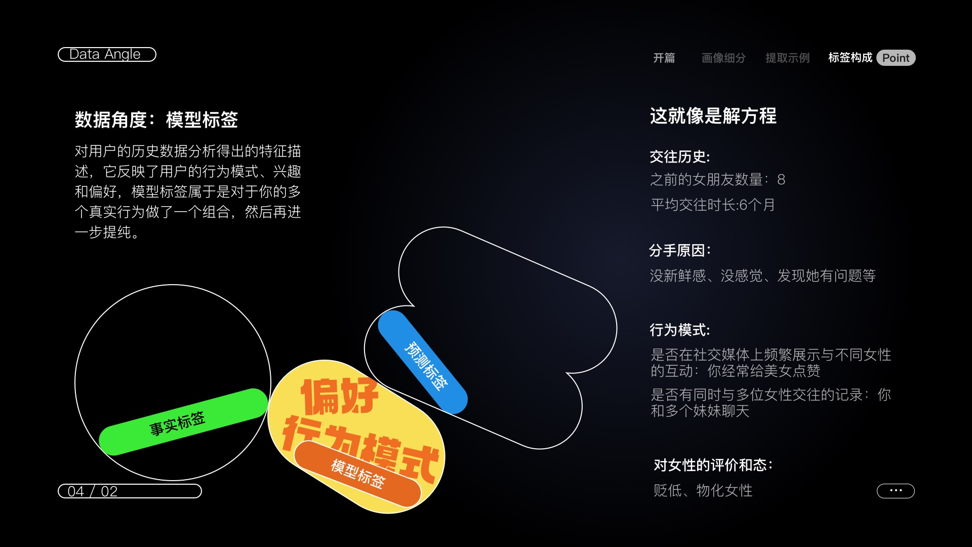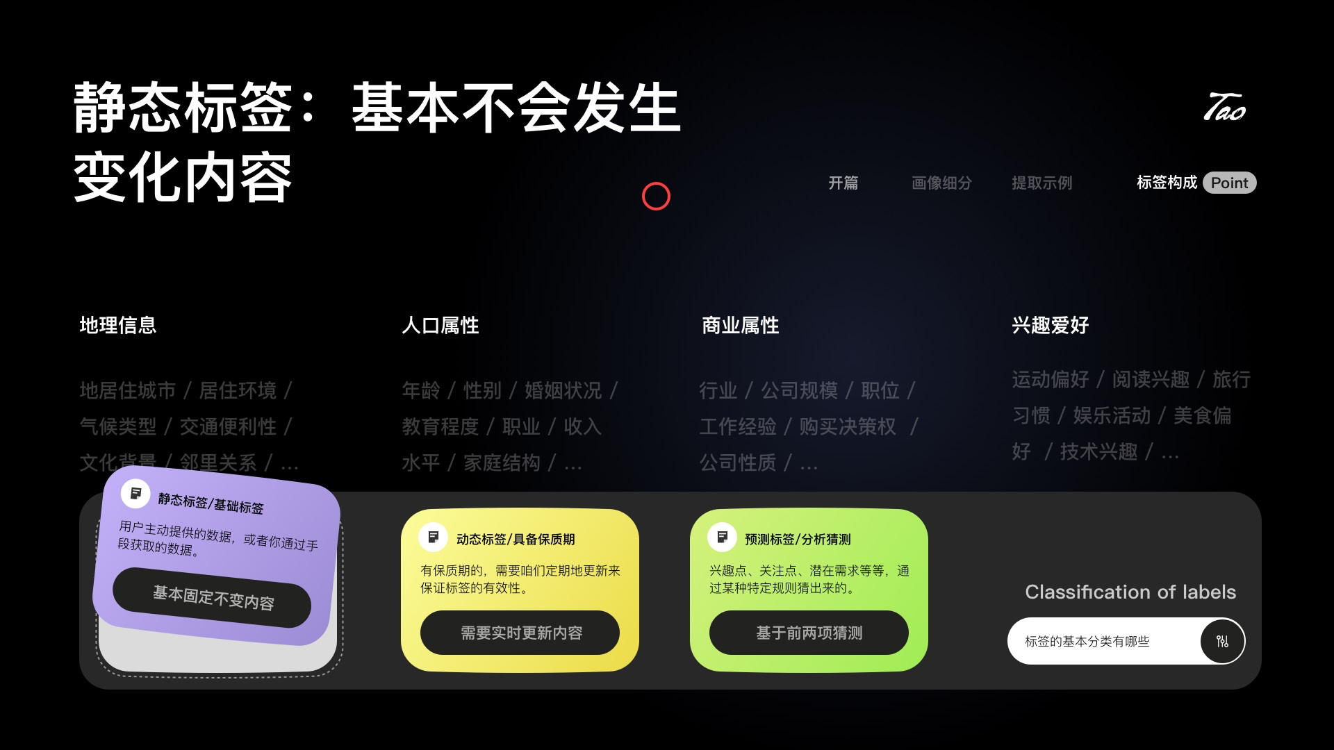 對某類人中的典型用戶跟蹤總結 ,其中包含個人屬性、生活方式、社會屬性、家庭屬性等等。