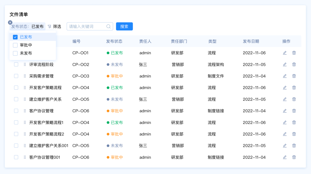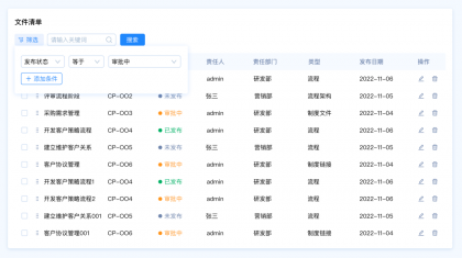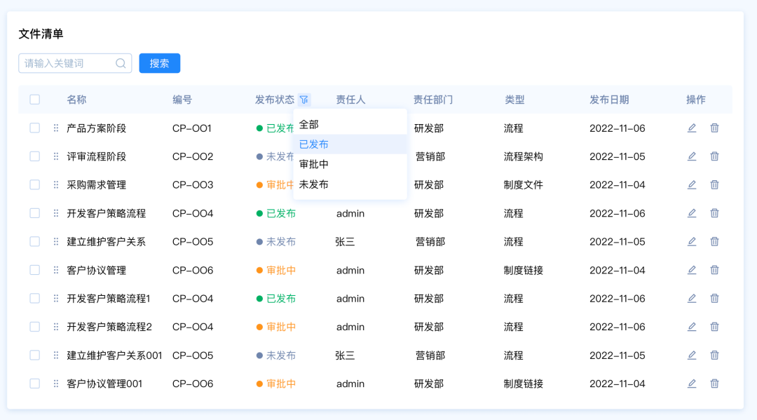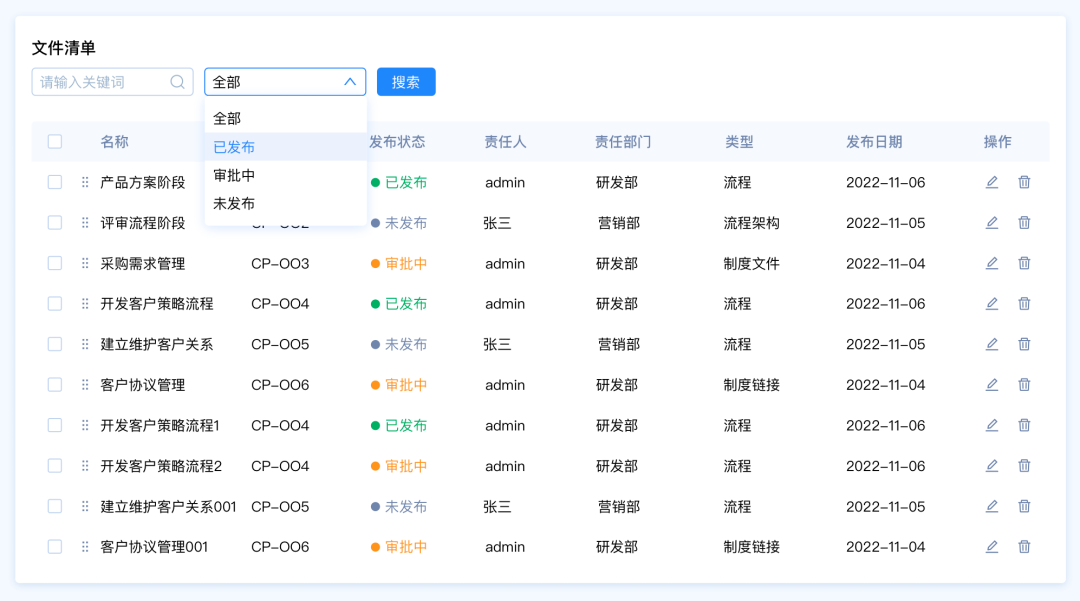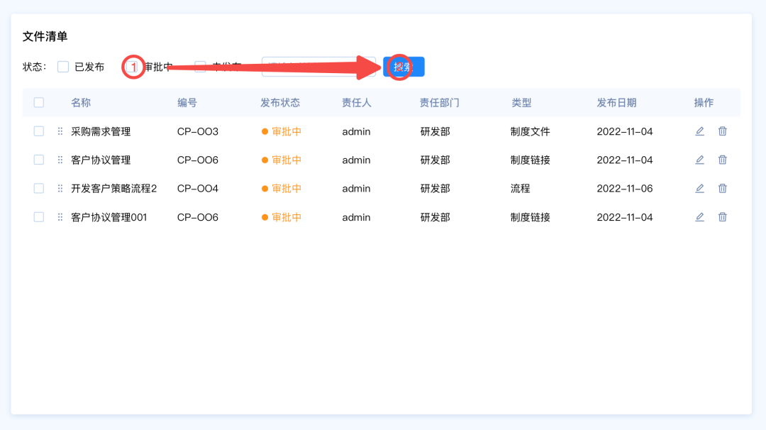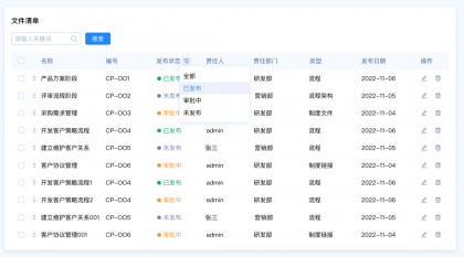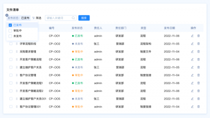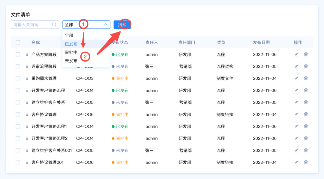 需求背景:客戶(hù)A想要快速篩選文件清單中發(fā)布狀態(tài)為“審批中”的數(shù)據(jù),希望能夠直接看到文件的狀態(tài)類(lèi)型,快速選擇類(lèi)型。