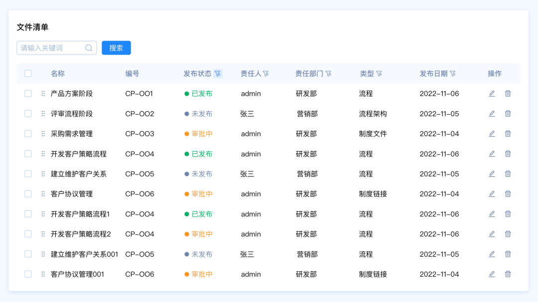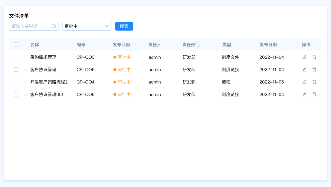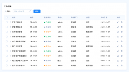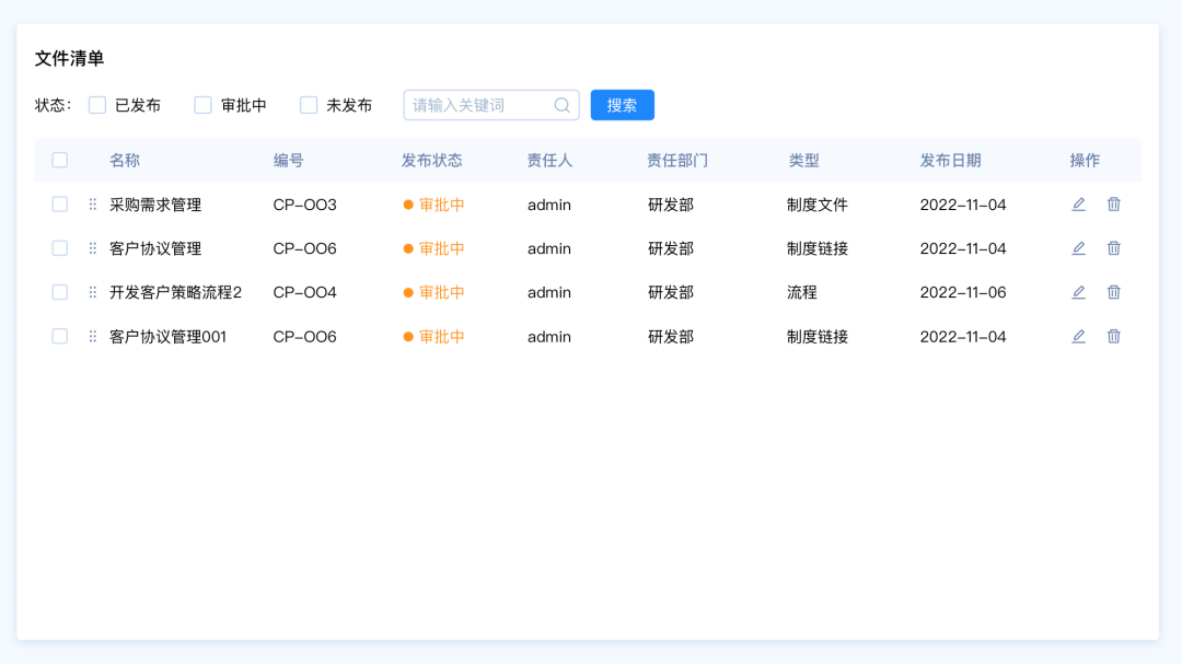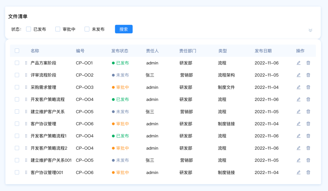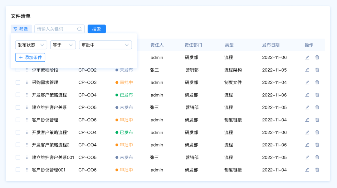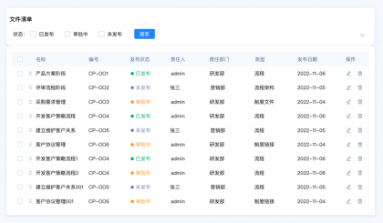 需求背景:客戶(hù)A想要快速篩選文件清單中發(fā)布狀態(tài)為“審批中”的數(shù)據(jù),希望能夠直接看到文件的狀態(tài)類(lèi)型,快速選擇類(lèi)型。