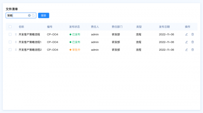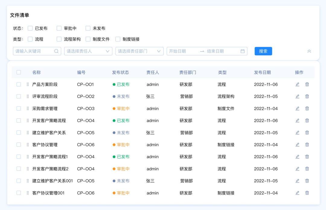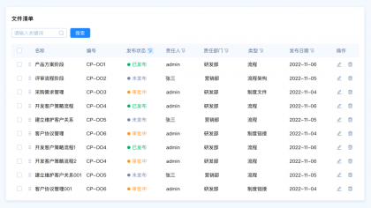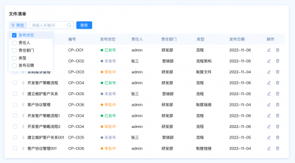 設(shè)計(jì)要點(diǎn):由于這里包含多種篩選類(lèi)型,名稱(chēng)和編號(hào)是關(guān)鍵詞篩選,發(fā)布狀態(tài)和、責(zé)任人、責(zé)任部門(mén)、類(lèi)型是選項(xiàng)篩選,發(fā)布日期是時(shí)間區(qū)間篩選。所以我們需要采用組合篩選的模式。