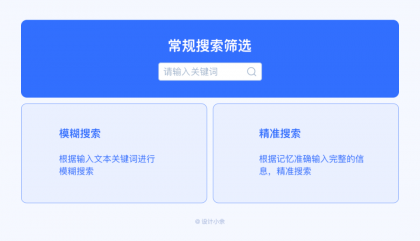 常規(guī)的搜索篩選不難理解,即常見(jiàn)的搜索框,根據(jù)輸入文本關(guān)鍵詞進(jìn)行模糊搜索或者根據(jù)記憶準(zhǔn)確輸入完整的信息,精準(zhǔn)搜索。文本關(guān)鍵詞搜索需要通過(guò)用戶(hù)的記憶來(lái)完成,只有當(dāng)用戶(hù)對(duì)需要搜索的內(nèi)容(關(guān)鍵詞)有記憶才能完成搜索篩選,搜索的結(jié)果范圍根據(jù)關(guān)鍵詞的精準(zhǔn)度而定。