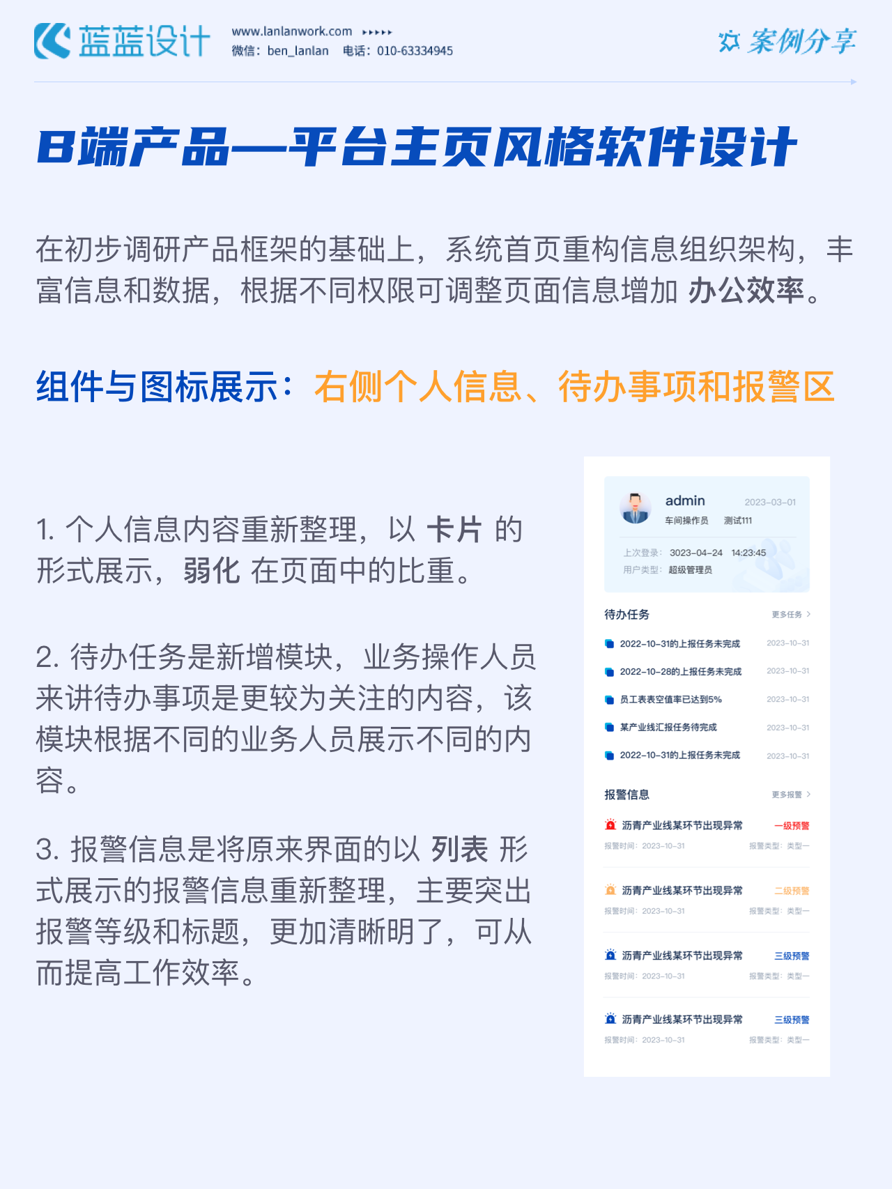 方案二:平臺主頁風(fēng)格 在初步調(diào)研產(chǎn)品框架的基礎(chǔ)上,系統(tǒng)首頁重構(gòu)信息組織架構(gòu),豐富信息和數(shù)據(jù),根據(jù)不同權(quán)限可調(diào)整頁面信息增加辦公效率。設(shè)計(jì)風(fēng)格采用簡約的設(shè)計(jì)語言,模塊化布局,方圓并構(gòu)的設(shè)計(jì)模式,界面強(qiáng)調(diào)可復(fù)用性和通用性,配色采用品牌色,品牌融合度高。