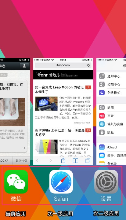 新的多任務界面依然是通過雙擊 Home 鍵觸發(fā),但無論界面和使用方式,和上一代系統(tǒng)已有了本質(zhì)的區(qū)別。