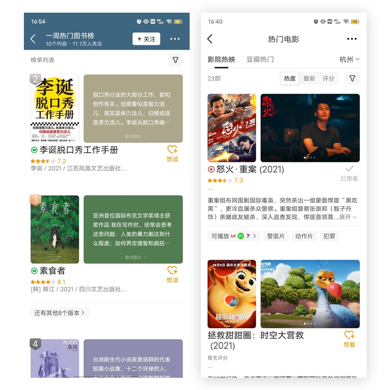 豆瓣的電影榜單設計非常巧妙:豎幅圖片完美展示電影海報,橫幅區域則用于劇照輪播。這種豎橫搭配不僅視覺和諧,還能比單圖展示更高效地利用空間。這個設計模式同樣適用于圖書榜單,橫幅區域可以展示書評。通過呈現豐富的信息,用戶能在列表頁就對內容有更全面的了解,從而提高查看詳情頁的意愿。