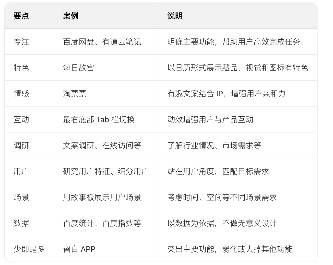 - 答案:設(shè)計(jì)前的案例分析包含專注(明確主要功能)、特色(區(qū)別于同行的功能、體驗(yàn)或視覺)、情感(加入情感化設(shè)計(jì))、互動(dòng)(運(yùn)用動(dòng)效)、調(diào)研(了解行業(yè)和市場)、用戶(研究用戶特征和需求)、場景(考慮用戶使用場景)、數(shù)據(jù)(以數(shù)據(jù)為設(shè)計(jì)依據(jù))、少即是多(突出主要功能)這 9 個(gè)關(guān)鍵要點(diǎn)。