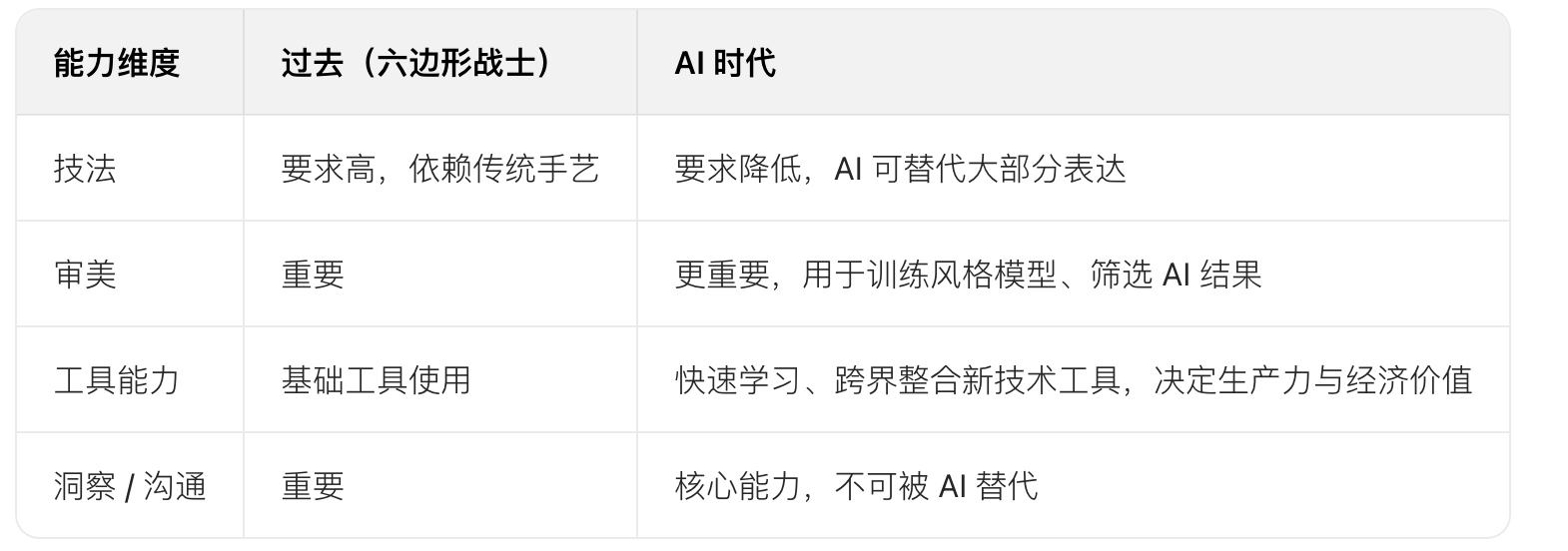 現在:“AI” 木板已達 100 米,而審美、洞察等其他木板僅 5 米,后者成為能力瓶頸,需重點補齊。