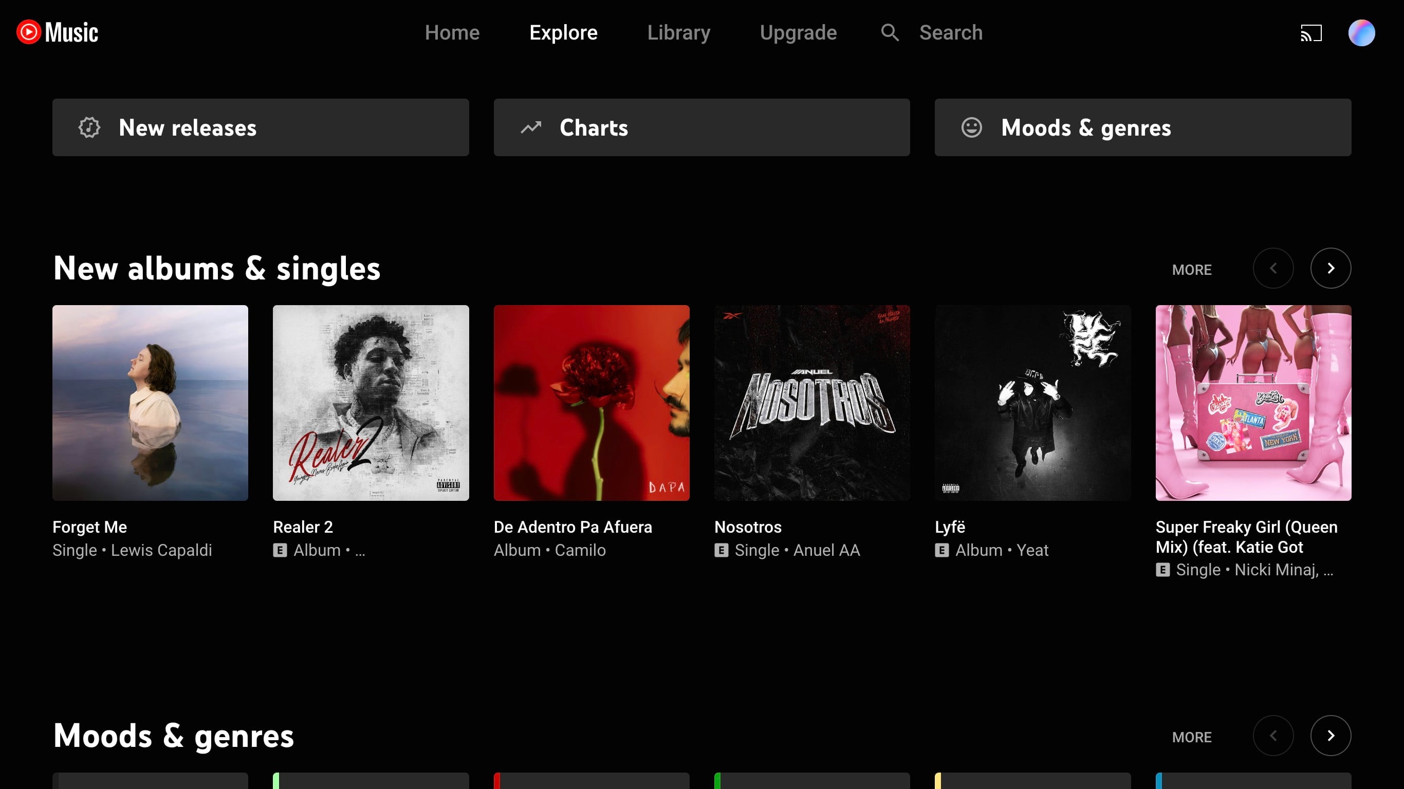 層次感:大標(biāo)題(如“New albums & singles”)→ 模塊標(biāo)題 → 內(nèi)容卡片 → 二級(jí)信息。