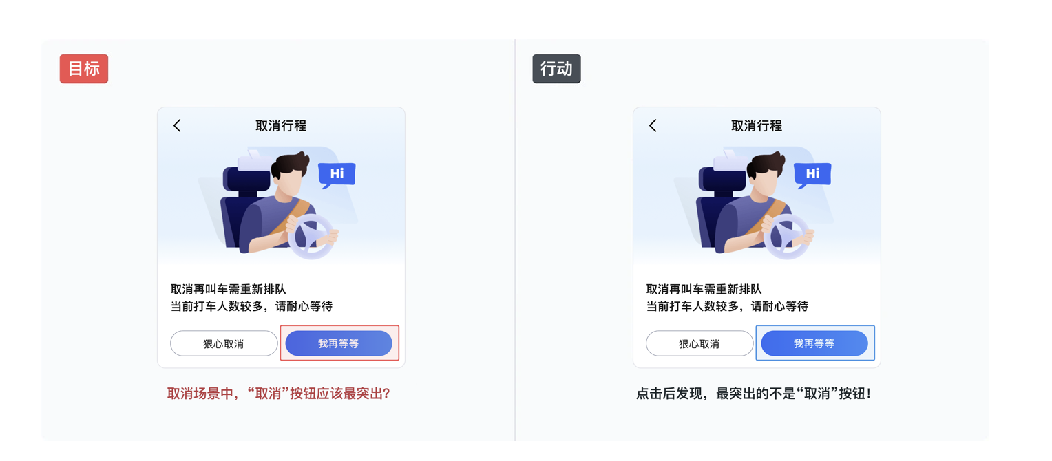 比如看到 APP 里一個(gè)顯眼的紅色按鈕,以為是 “返回”,點(diǎn)擊后卻發(fā)現(xiàn)是 “提交訂單”;在打車(chē)軟件里,把 “狠心取消” 當(dāng)成 “查看詳情”。這種錯(cuò)誤源于 “規(guī)劃階段”,是界面信息混亂、層級(jí)不清晰導(dǎo)致的 —— 用戶(hù)不是手滑,是被設(shè)計(jì) “誤導(dǎo)” 了。