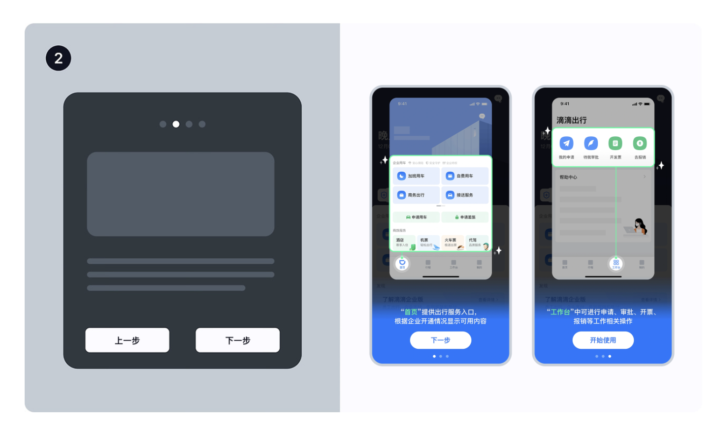 - 例子:滴滴企業(yè)版的新手引導(dǎo),先講 “首頁有出行服務(wù)入口”,再講 “工作臺能審批、開票”,每步只傳遞一個信息,用戶不會覺得混亂;