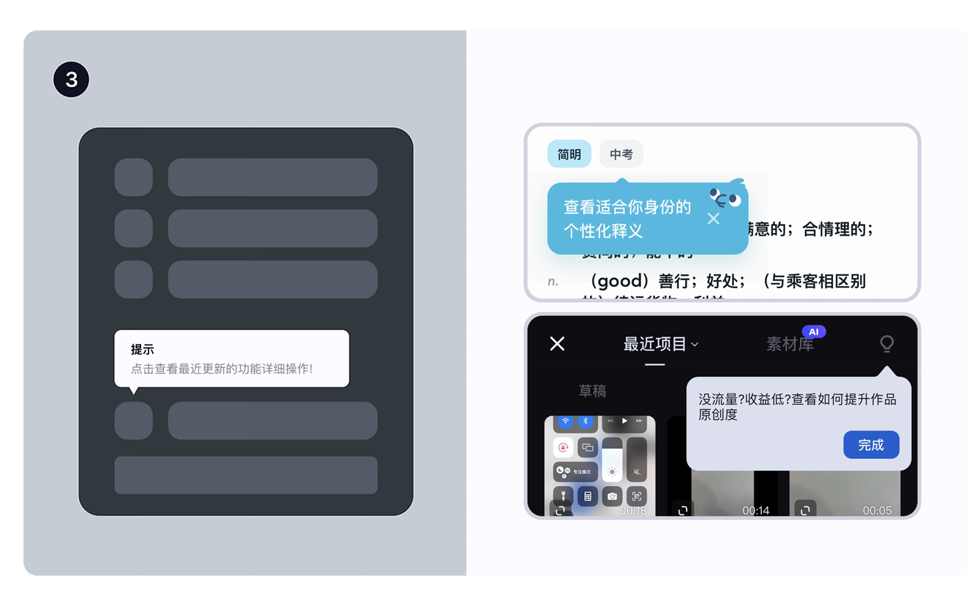 當(dāng)用戶第一次點擊某個功能(比如新按鈕、新模塊)時,用小氣泡給出簡短說明,不打斷操作流程,很適合功能細(xì)節(jié)引導(dǎo)。