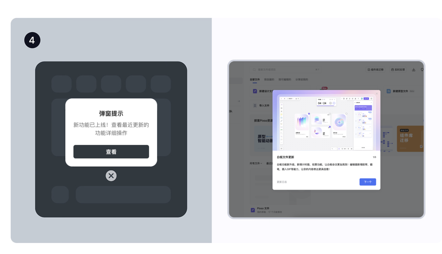 - 例子:Pixso 更新白板功能后,用彈窗提示 “新增計時器、投票功能”,用戶看完能直接點 “查看” 或 “關(guān)閉”;