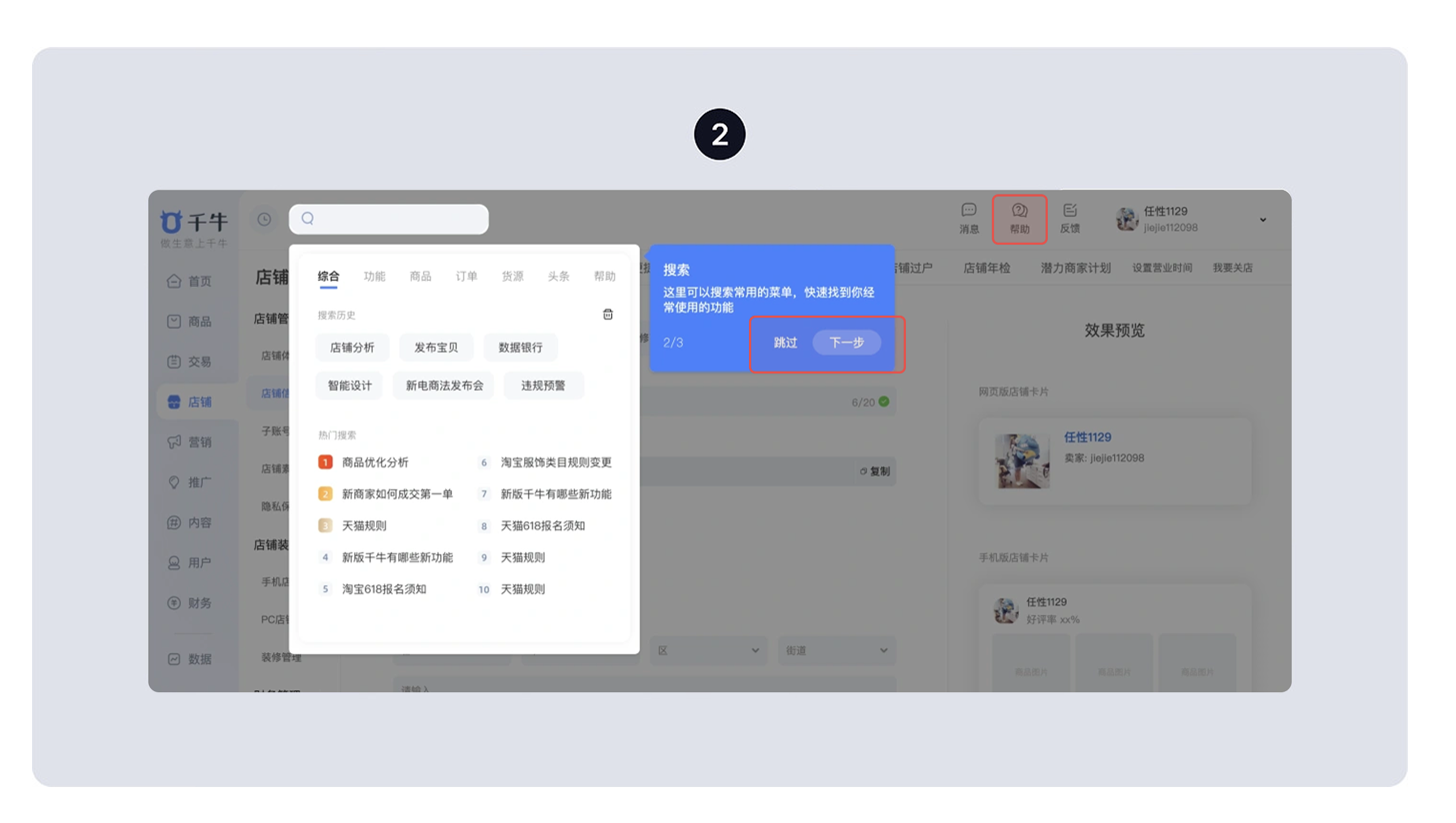 - 例子:千牛 APP 的新手引導(dǎo)會提示 “這里能搜索常用功能”,用戶可以點 “下一步” 繼續(xù)看,也能直接點 “跳過”;Notion 沒有強(qiáng)制引導(dǎo),而是單獨(dú)做了 “幫助頁面”,用戶有問題再去查;