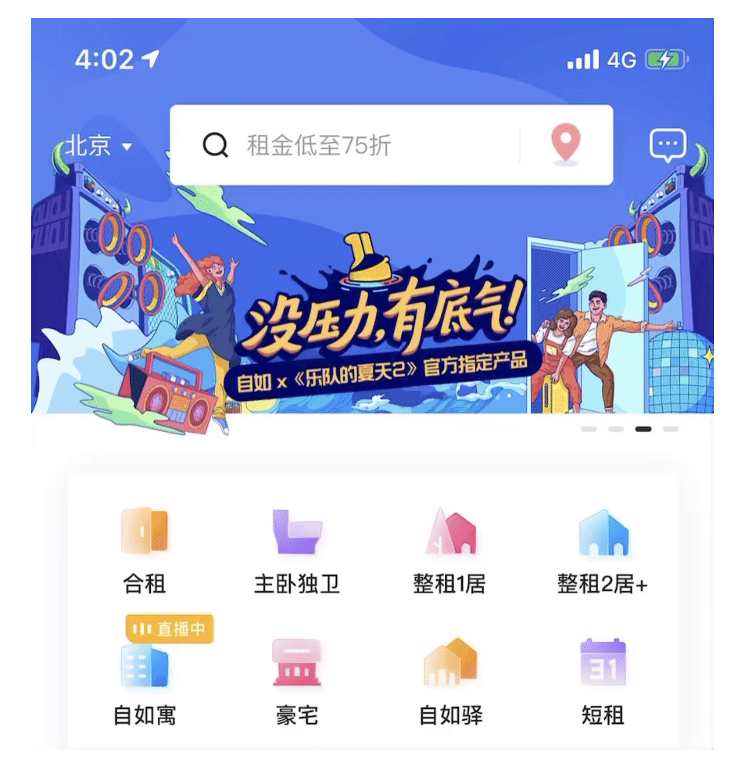 通欄 Banner 是首屏的 “常客”—— 它占據整個頁面寬度,視覺沖擊力強,適合傳遞單一、重要的信息,比如產品的年度活動、核心功能更新。以自如的首頁 Banner 為例,通欄設計搭配 “租金低至 75 折” 的大標題,配合分層視覺效果,瞬間抓住用戶對 “優惠” 的注意力;再如工具類 APP 的 “版本更新” Banner,通欄布局讓 “立即升級” 的入口更突出,降低用戶操作成本。