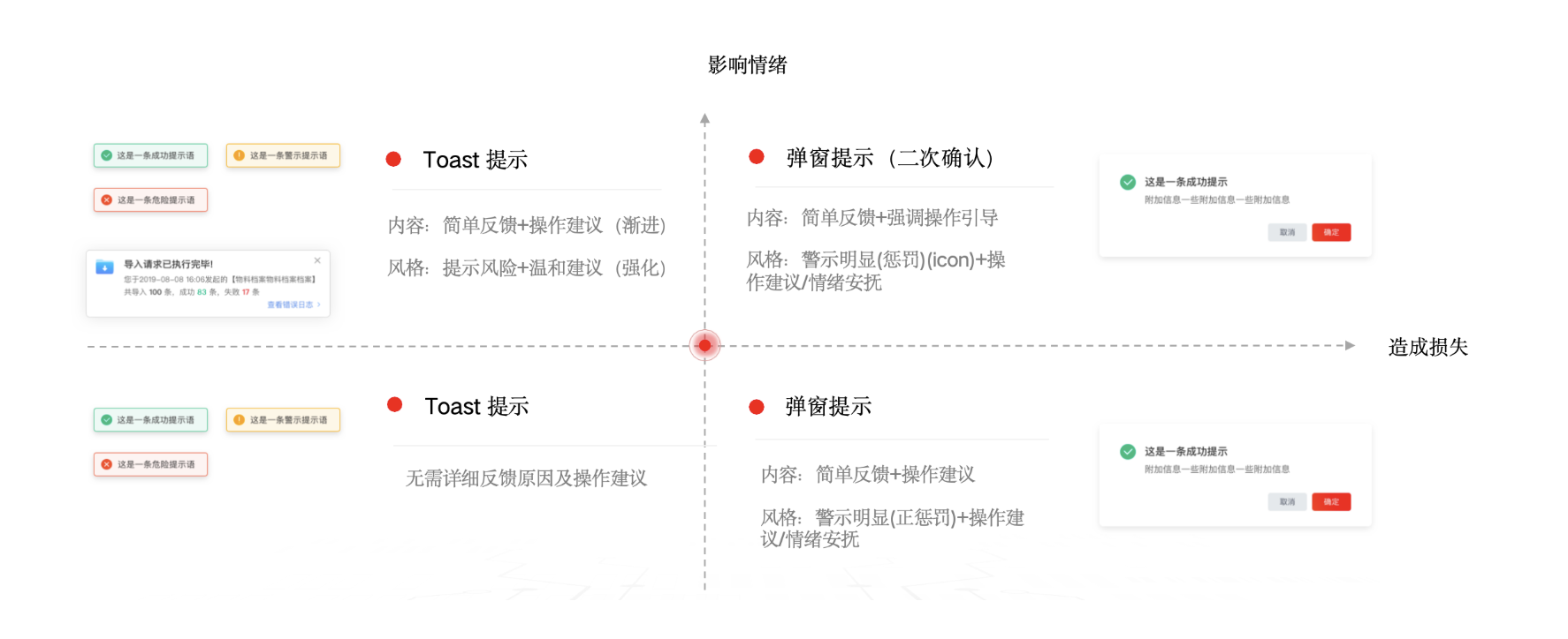 - 力度適當:根據風險等級調整語氣,預判用戶可能面臨的損失或情緒變化。比如普通操作失敗,不用過于否定,“當前已是第一輪,操作失敗!” 改為 “當前為第一輪審批,暫無法執行該操作” 更溫和;涉及數據安全的重要提示,語氣可稍重但不命令,“現在關閉您的信息可能會丟失” 比 “關閉就丟數據” 更易接受。