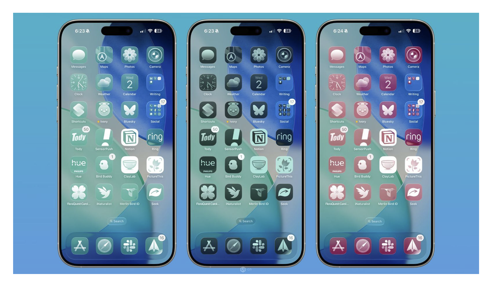 圖標(biāo)系統(tǒng)迎來重大升級(jí),除了默認(rèn)、深色、有色三種樣式,新增的 "清除圖標(biāo)" 堪稱點(diǎn)睛之筆。這種圖標(biāo)完全透明,直接借用壁紙顏色,僅以上方的白色圖形標(biāo)識(shí)功能,搭配 "淺色(磨砂玻璃質(zhì)感)" 和 "深色(有色玻璃質(zhì)感)" 兩種選項(xiàng),讓桌面風(fēng)格既能極簡(jiǎn)純粹,又能與壁紙形成巧妙呼應(yīng)。