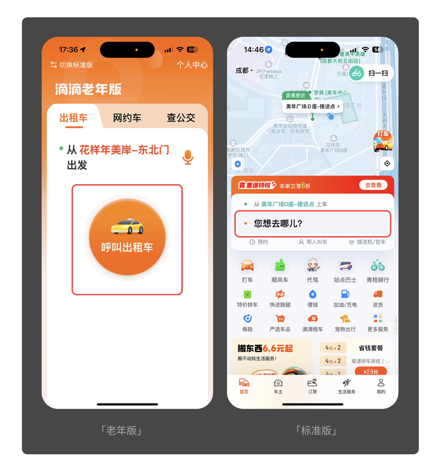 老年用戶對復雜界面的接受度較低,簡潔明了的布局能有效減少挫敗感。淘寶老年版摒棄了標準版密密麻麻的功能模塊和促銷信息,僅保留 “我的訂單”“購物車”“常用店鋪” 等核心功能,并用超大字體和醒目圖標展示,讓老年人一眼就能找到所需功能。滴滴老年版的界面也做了類似優(yōu)化,去除了特價拼車、快送跑腿等次要服務,僅保留出租車、網(wǎng)約車等核心出行功能,避免用戶因選擇過多而困惑。