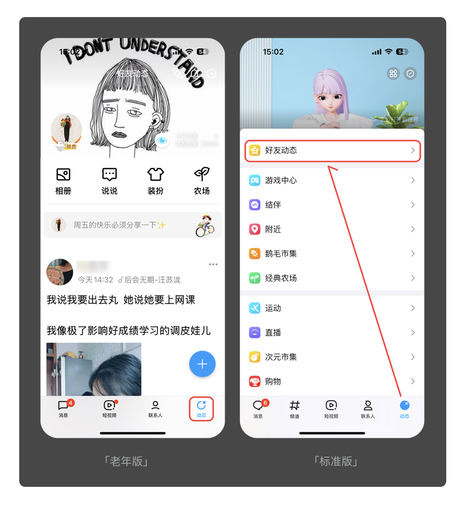 對老年人而言,多余的操作步驟就是無形的門檻。優(yōu)秀的適老化設計會砍掉非必要功能,讓核心需求一鍵直達。滴滴老年版便是典型案例:標準版需要先輸入目的地再點擊叫車,而老年版直接在首頁設置 “呼叫出租車” 大按鈕,省去輸入環(huán)節(jié),讓用戶無需學習就能完成叫車。QQ 老年版同樣簡化了動態(tài)查看流程,標準版需兩次點擊才能進入的頁面,老年版一次點擊即可直達,大幅提升操作效率。