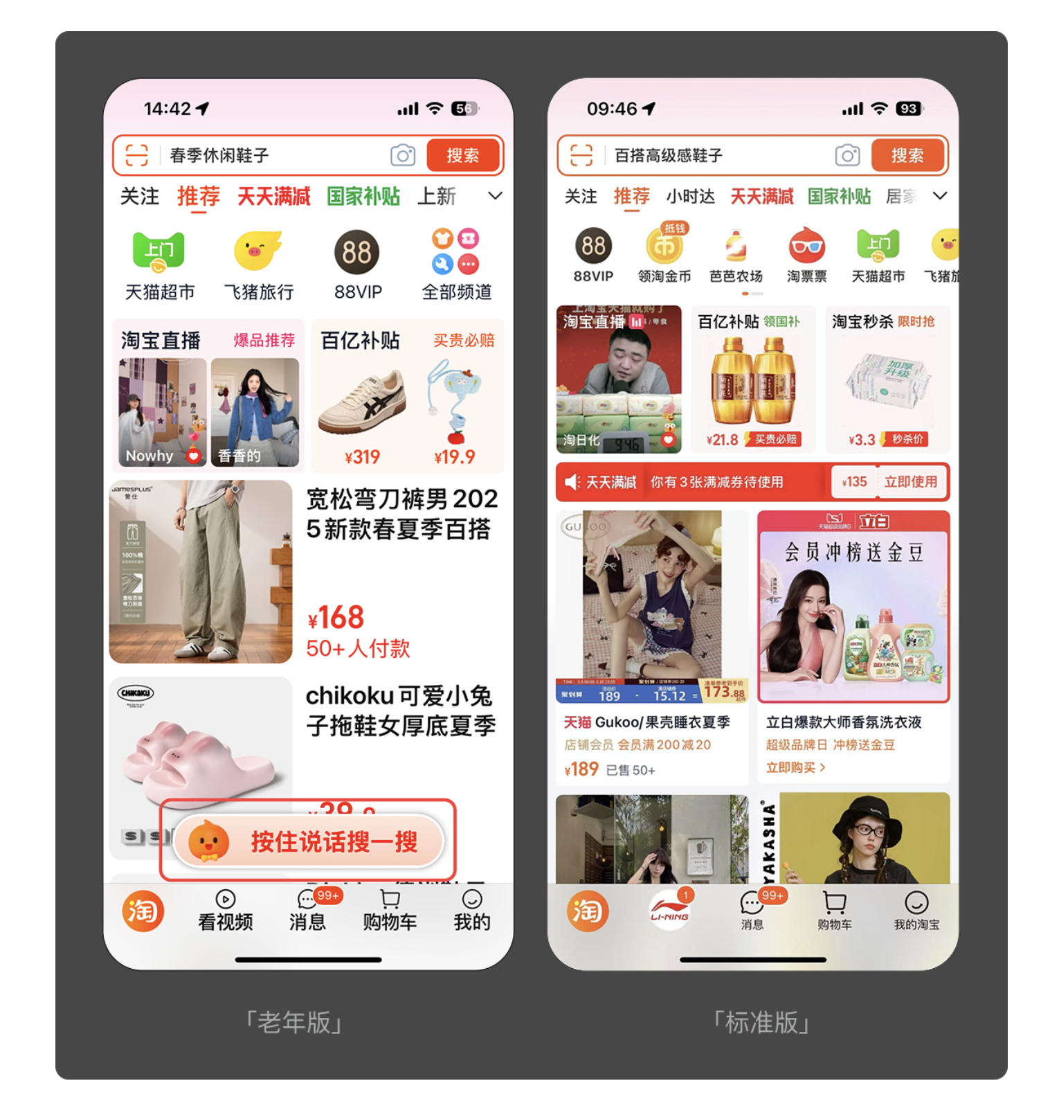 打字對很多老年人來說是一大難題,語音操作成為適老化設計的重要突破口。淘寶老年版在底部導航欄設置 “按住說話搜一搜” 按鈕,用戶無需手動輸入商品名稱,只需用語音描述就能完成搜索;中國工商銀行老年版也加入了語音操作功能,老年人可通過語音指令完成賬戶查詢、生活繳費等操作,替代了繁瑣的手動點擊和輸入。