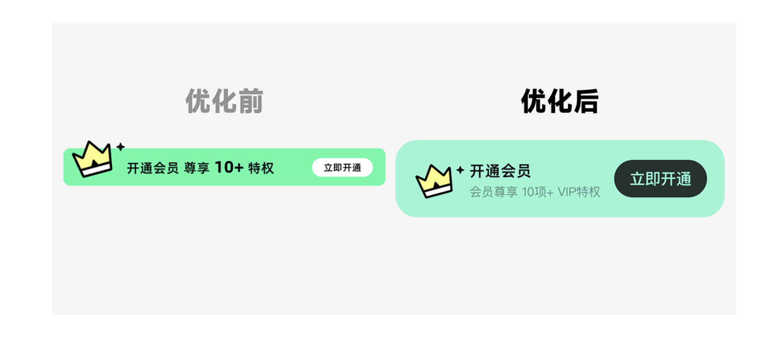 想要提升點擊轉(zhuǎn)化,需主動增加視覺層級:首先拆分文案,標題放大加粗,次要信息(如 “10 項 + VIP 特權(quán)”)縮小弱化,形成清晰的信息主次;其次優(yōu)化按鈕設(shè)計,選用高對比度顏色(如黑色背景搭配白色文字),調(diào)整按鈕尺寸,讓按鈕更突出;最后添加細節(jié)裝飾,比如給卡片增加半圓切割背景、輕微投影,增強空間感,讓入口設(shè)計更有記憶點。