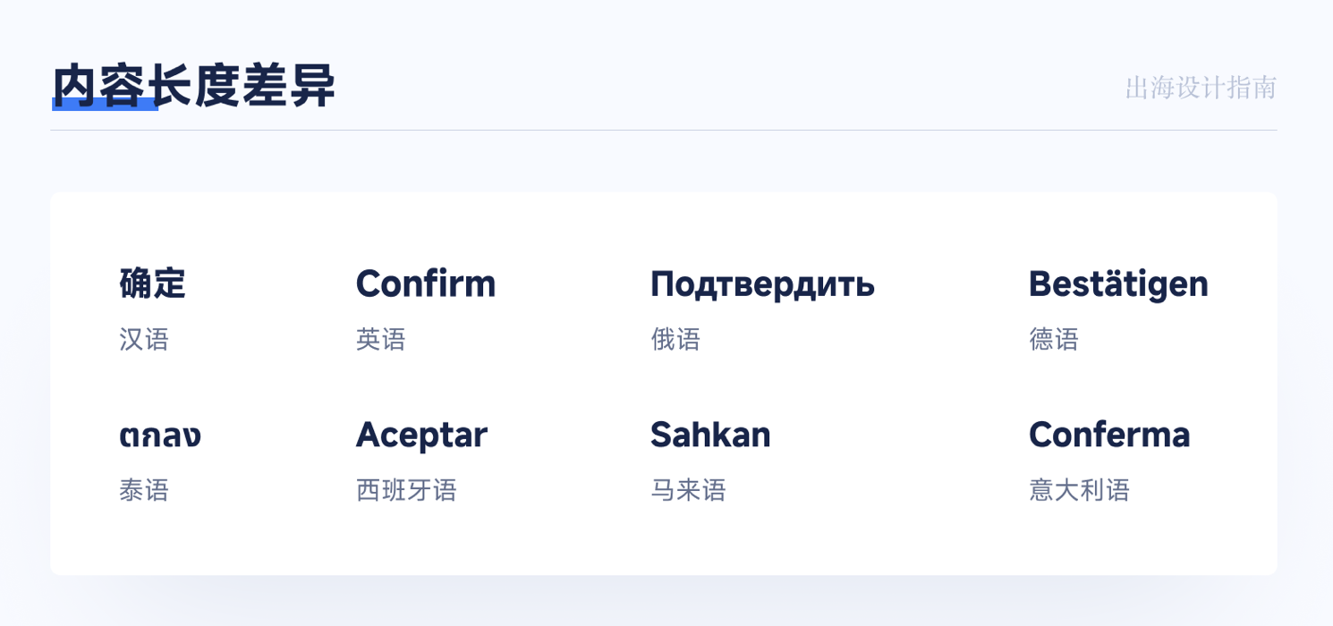 • 文本長度差異:大多數表音語言(如英語、俄語、德語)的文本長度比中文長 30%~50%,直接套用中文排版會出現文字截斷、布局錯亂的問題。例如中文 “確定” 僅 2 字,英語 “Confirm” 為 7 字母,俄語 “NoдtBepAиTb” 長達 11 字符,空間預留不足會導致關鍵信息不可讀。