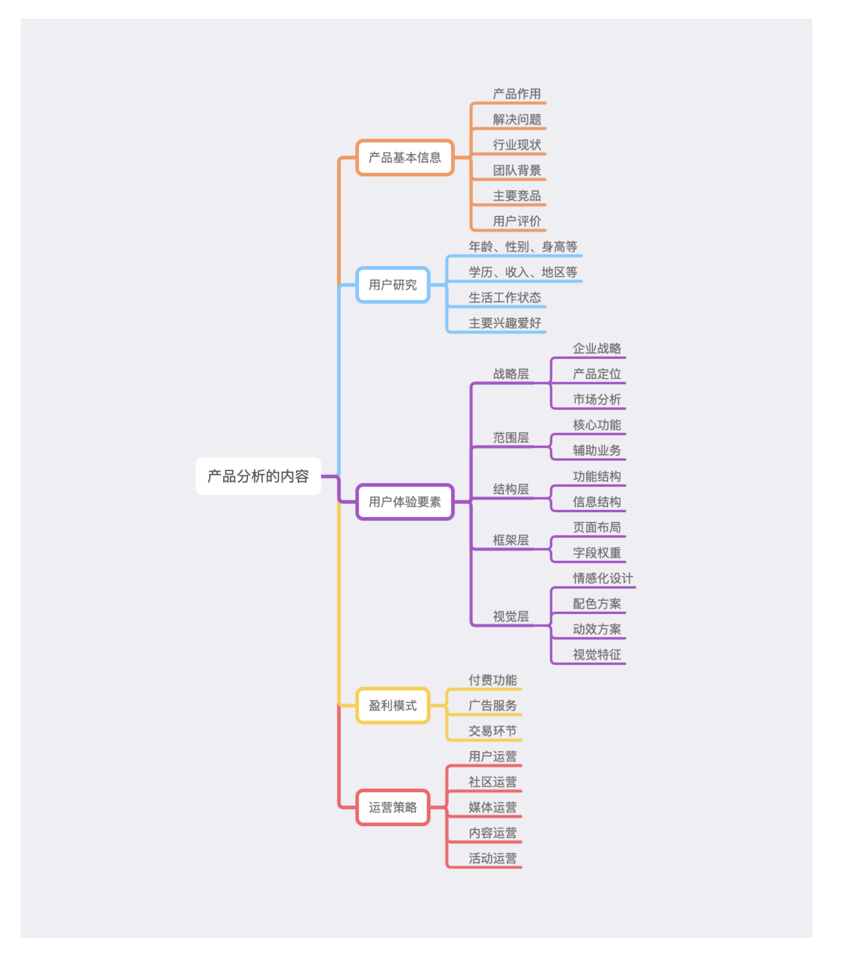 基于基礎(chǔ)信息,從 “用戶研究→用戶體驗(yàn)五要素→盈利模式→運(yùn)營(yíng)策略” 四個(gè)核心維度展開分析,每個(gè)維度都需緊扣前期設(shè)定的目標(biāo)。