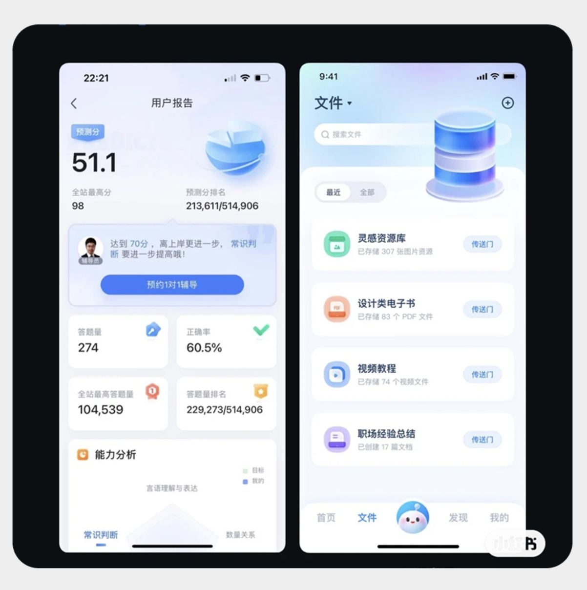 例如設計資源庫的 “電子書合集”“視頻教程” 卡片,學習平臺的 “能力分析”“答題報告” 卡片,會標注文件數量、答題正確率、排名等信息,讓用戶快速獲取核心分類線索。