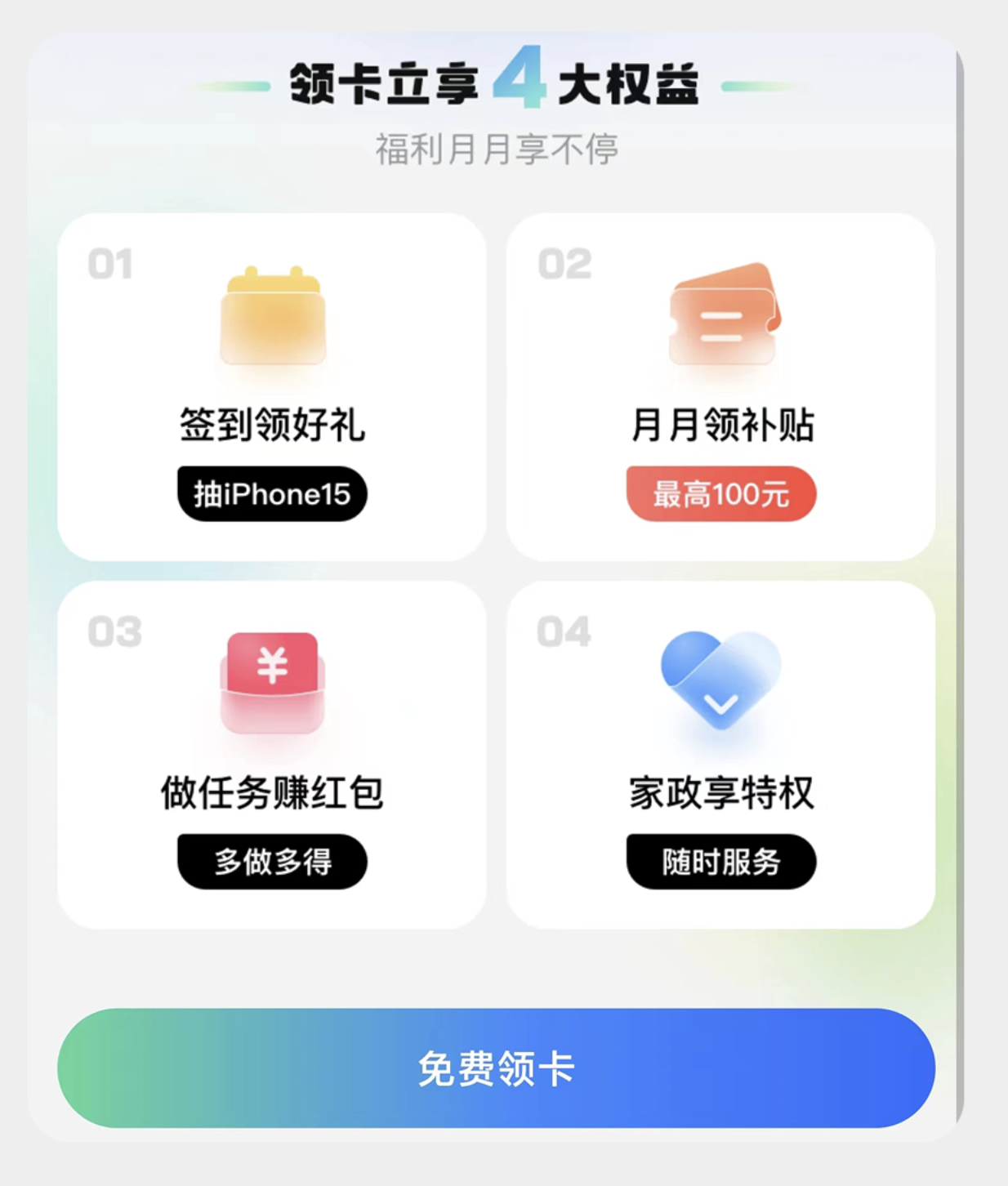 比如會員權益卡片、產品功能介紹卡、活動福利卡,常通過分點列舉的方式展示 “簽到領禮”“專屬補貼”“會員特權” 等內容,搭配醒目的引導按鈕,強化價值傳遞。