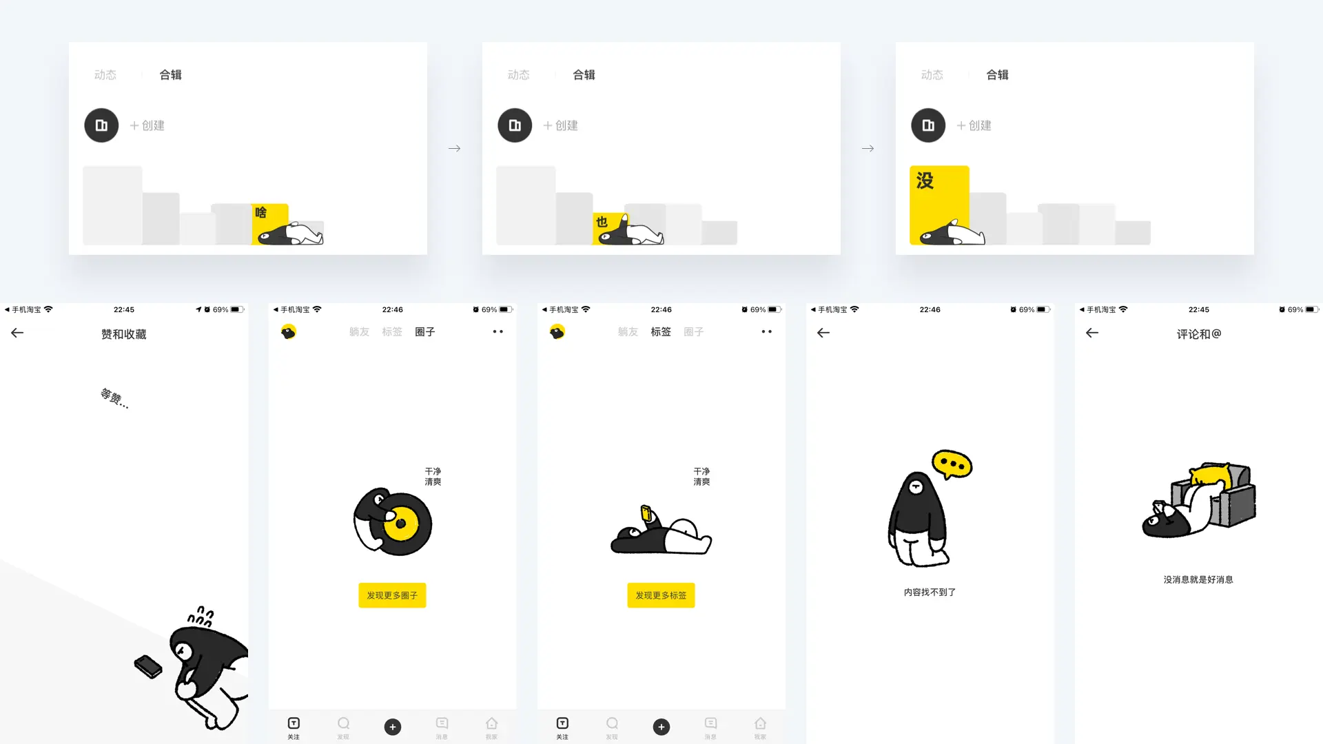 設(shè)計師可結(jié)合產(chǎn)品屬性與品牌視覺體系,延展圖形設(shè)計,搭配動效、插畫等形式,豐富缺省頁內(nèi)容。比如躺平的空白頁,設(shè)計出賤萌有趣的視覺場景,一句 “沒消息就是好消息”“內(nèi)容找不到了,發(fā)現(xiàn)更多圈子”,讓用戶在無奈的場景下會心一笑,將負(fù)面情緒轉(zhuǎn)化為輕松的體驗,讓產(chǎn)品充滿趣味性與人情味。