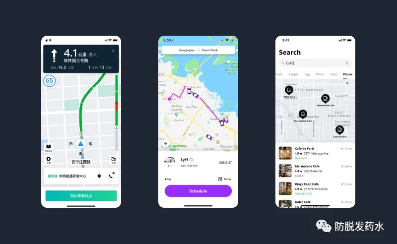 以用戶的當前位置為核心,展示周邊相關信息,適用于地圖、本地生活、出行類產品,比如: