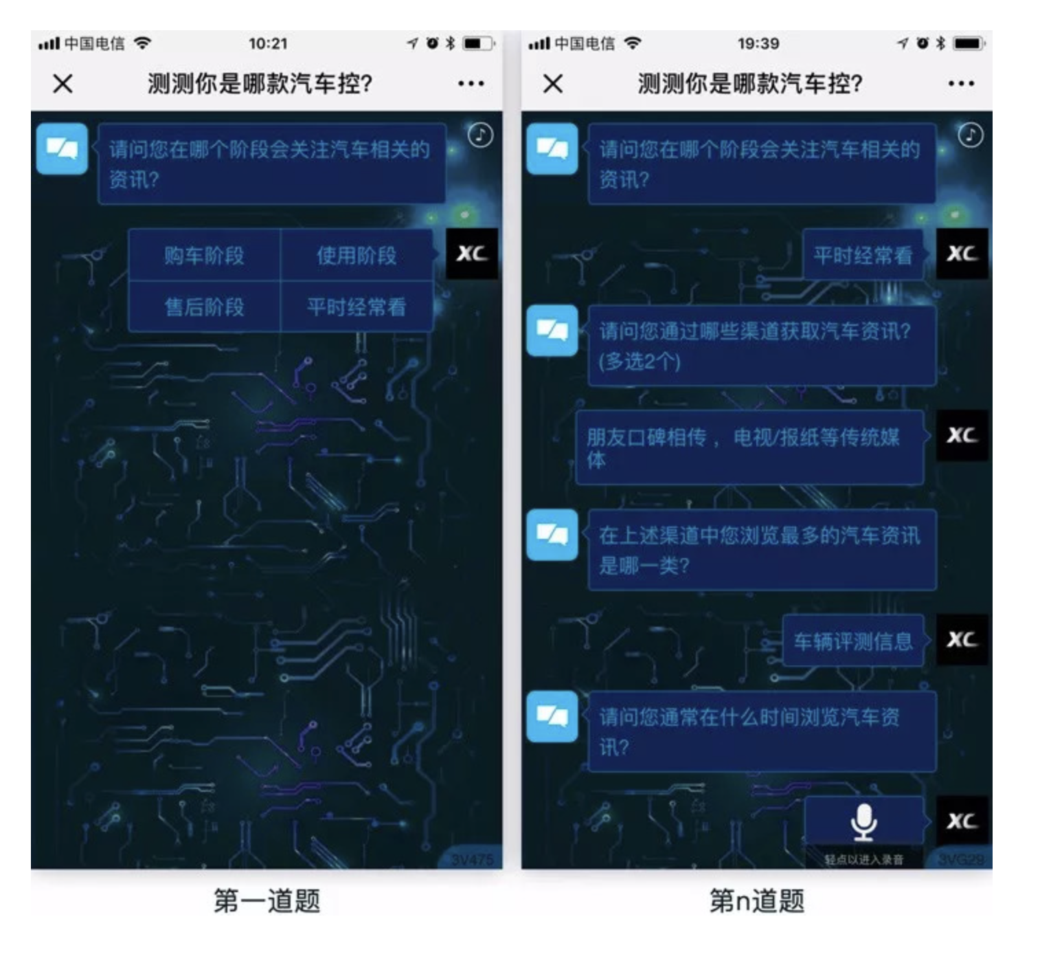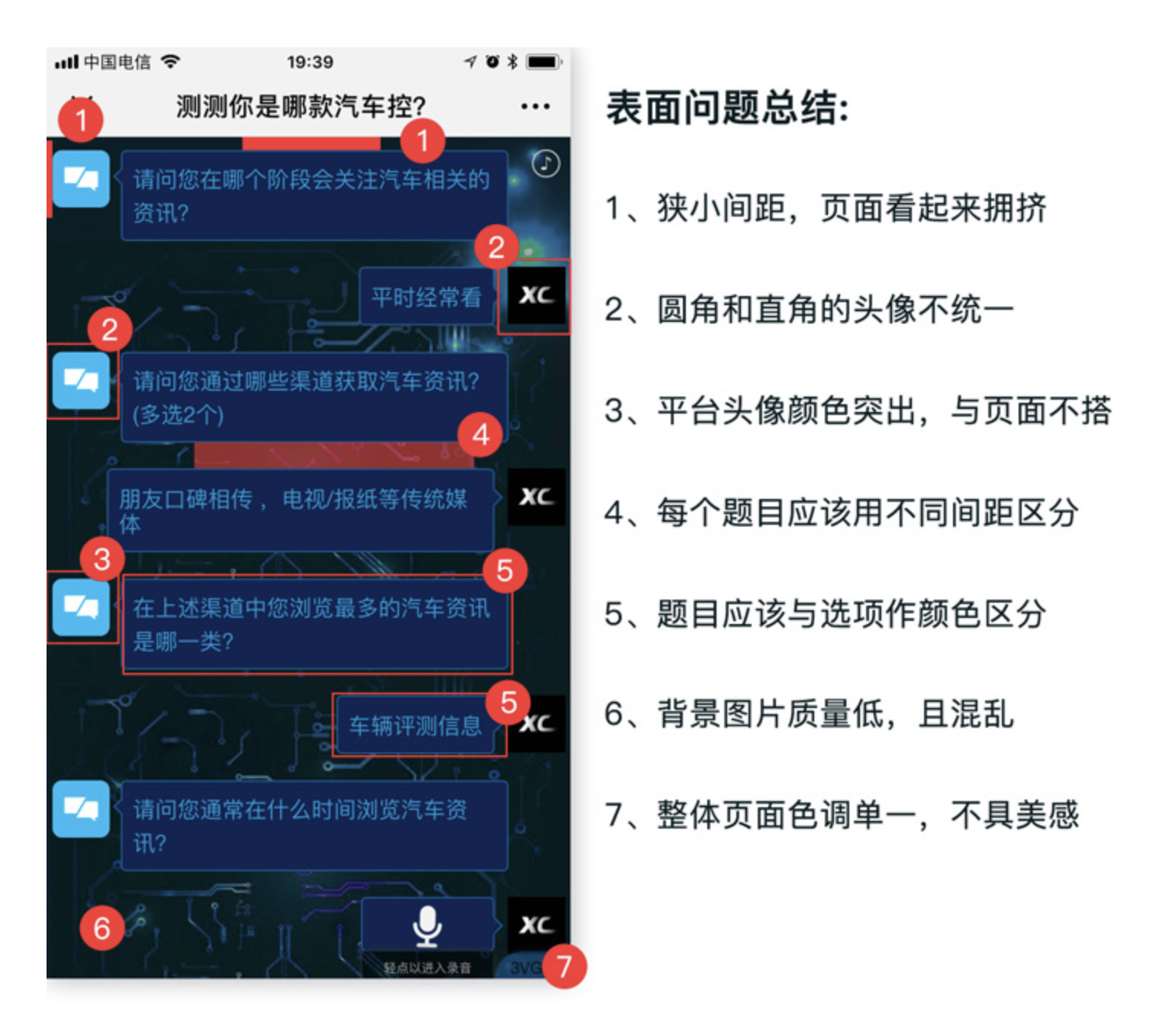 本次案例為一款以人機對話 UI(Conversation UI,簡稱 CUI) 為形式的汽車問答測評 H5,相較于傳統問答測評模式,該設計在形式上做出了創新,本應具備體驗優勢,但實際落地后卻出現了諸多體驗問題。先來看這份設計的創新優勢,再逐一拆解其核心痛點。