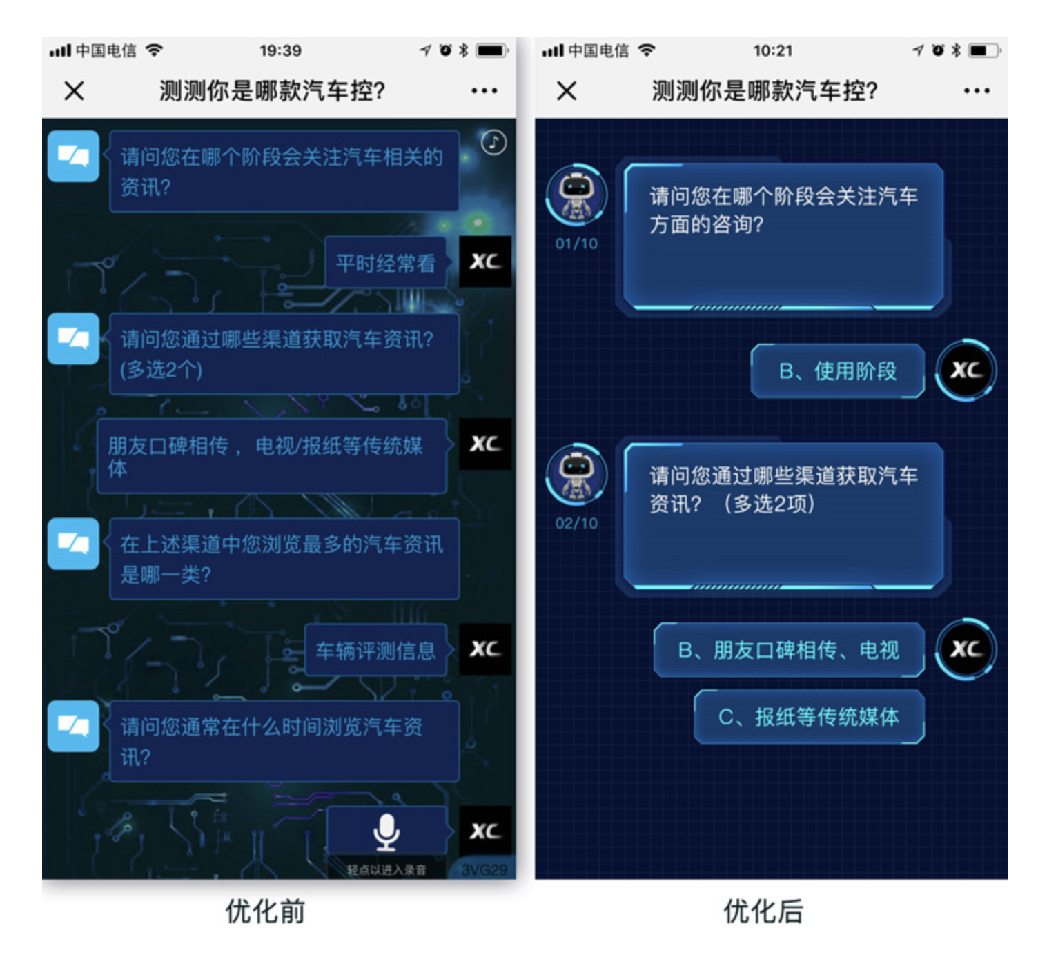 基于「形式追隨功能」的核心思路,我們對該汽車測評 H5 進行了全維度優化,通過減少視覺入口、動畫引導、強化視覺牽引、區分對話框四大核心視覺引導技法,解決原有設計的痛點,同時兼顧人機對話的科技感與智能感,實現形式與功能的平衡。以下為具體優化思路與技法落地: