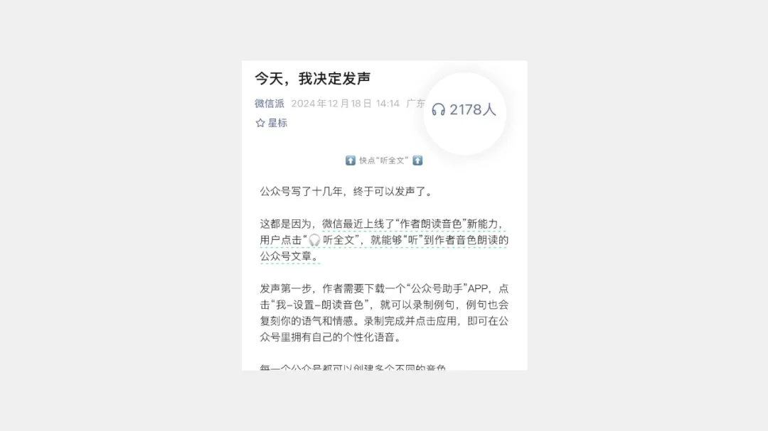“創(chuàng)作者音色復(fù)刻”功能的誕生,是為提升公眾號(hào)“聽(tīng)全文”功能的體驗(yàn)。通過(guò)此功能,作者僅需朗讀一段系統(tǒng)提供文本,AI 即可復(fù)刻出作者音色。復(fù)刻后,讀者就可以在聽(tīng)全文時(shí)能聽(tīng)到 AI 模仿作者的專(zhuān)屬音色,本文將聚焦的是作者錄入并復(fù)刻音色的流程。