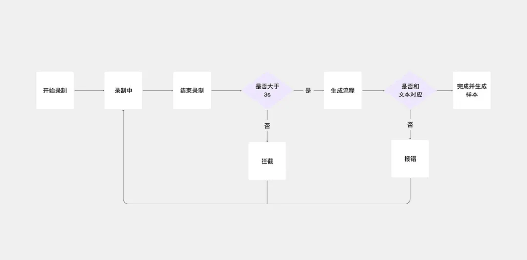 在“創(chuàng)作者音色復(fù)刻”項(xiàng)目中,作者通過(guò)“邏輯流程圖”系統(tǒng)性梳理用戶(hù)交互路徑,目的是梳理所有反饋節(jié)點(diǎn)——包括主流程的 5 個(gè)核心反饋節(jié)點(diǎn),以及因系統(tǒng)判斷產(chǎn)生的 2 個(gè)反饋分支所衍生的額外 2 個(gè)反饋節(jié)點(diǎn),從而確保反饋設(shè)計(jì)覆蓋完整交互路徑,避免遺漏關(guān)鍵環(huán)節(jié)。