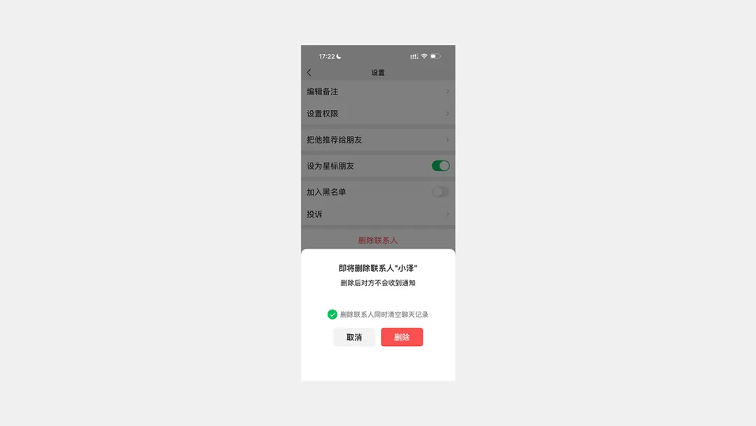 ▲微信刪除聯(lián)系人時(shí),界面會(huì)告知用戶(hù)當(dāng)前操作所造成的風(fēng)險(xiǎn),防止用戶(hù)錯(cuò)誤操作。