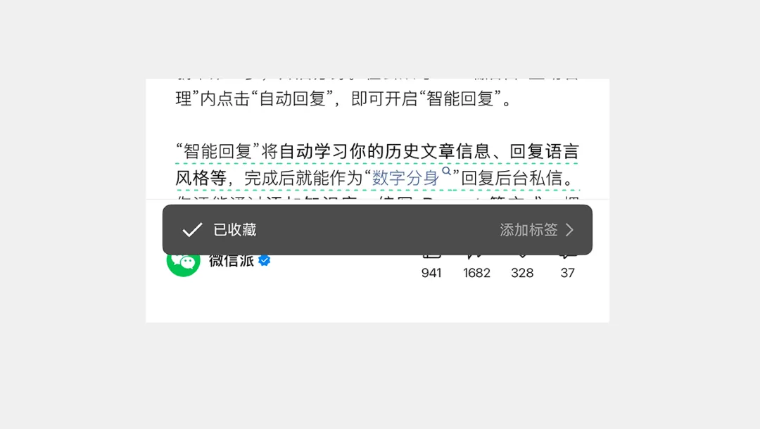 ▲用戶(hù)收藏公眾文章后,界面顯示“已收藏”并伴隨成功動(dòng)效,明確告知操作結(jié)果。