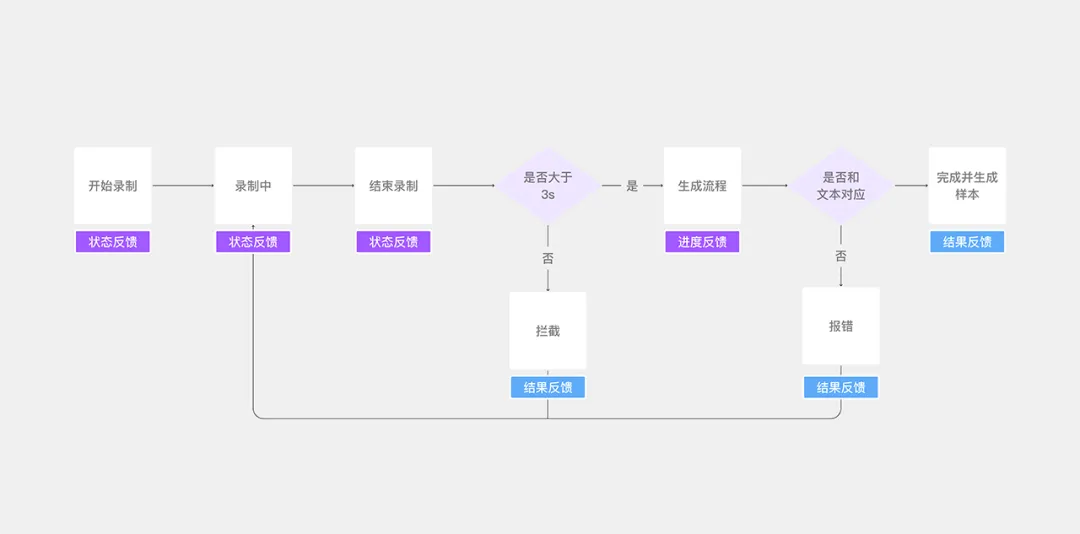 回到“創(chuàng)作者音色復(fù)刻”項(xiàng)目中,作者為每個(gè)反饋節(jié)點(diǎn)匹配了最貼合的類(lèi)型。例如,“開(kāi)始錄制”節(jié)點(diǎn)采用狀態(tài)反饋確保操作確認(rèn),“等待錄音處理”節(jié)點(diǎn)采用進(jìn)度反饋管理用戶(hù)等待預(yù)期,“朗讀完成”節(jié)點(diǎn)采用結(jié)果反饋明確操作結(jié)果。