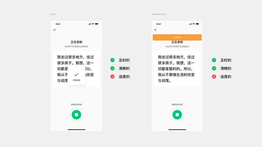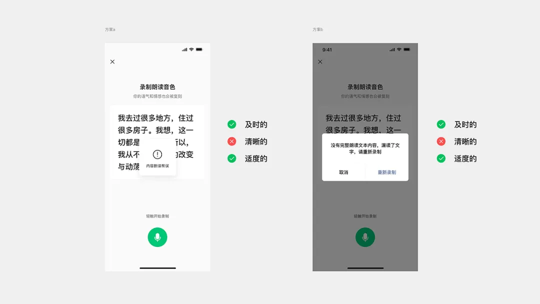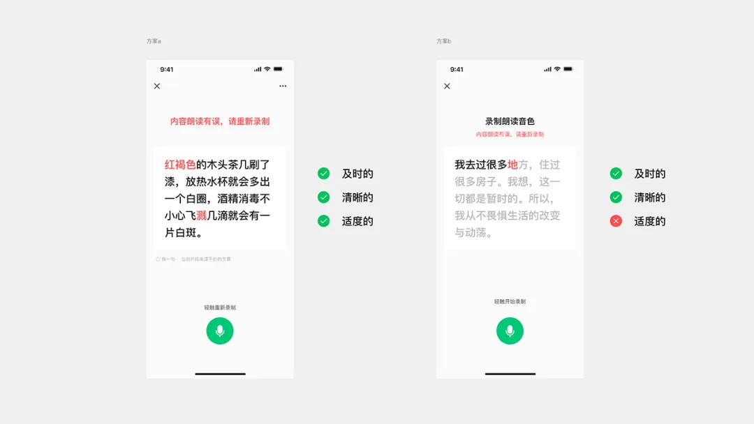 兩個(gè)優(yōu)化方案在“清晰”原則得到了完善,通過(guò)精準(zhǔn)的文字定位與明確的指引文案,消除了用戶(hù)的認(rèn)知不確定性。最后綜合用戶(hù)測(cè)試評(píng)估結(jié)果,發(fā)現(xiàn)方案 b 會(huì)在錄制過(guò)程中,會(huì)影響用戶(hù)在閱讀時(shí)候的專(zhuān)注度且隨時(shí)造成用戶(hù)任務(wù)中斷,違背了“適度”原則,最終選擇了方案 a 作為落地實(shí)施方案。