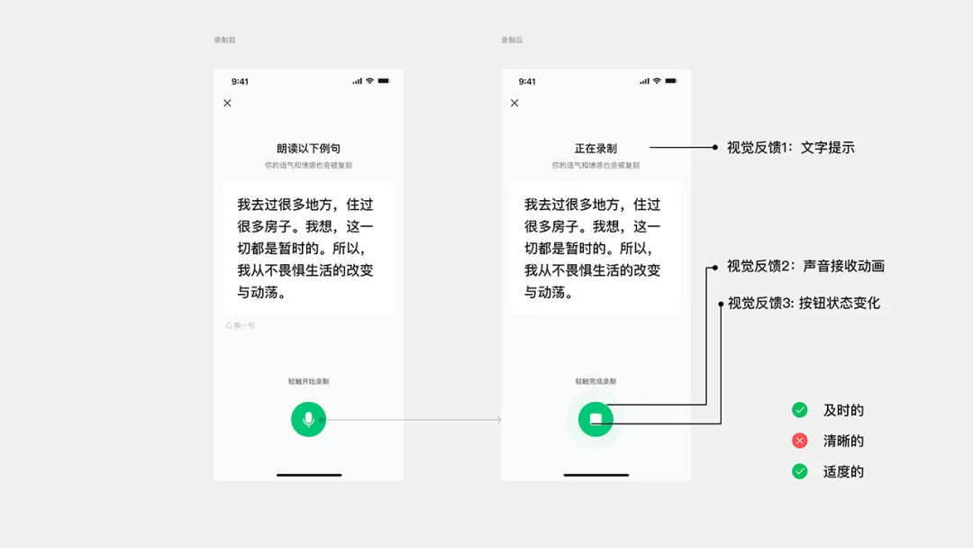 在啟動(dòng)音頻錄制的關(guān)鍵節(jié)點(diǎn),如何確保用戶(hù)明確感知界面狀態(tài)切換,并及時(shí)開(kāi)始朗讀,是本案例的設(shè)計(jì)重點(diǎn)。