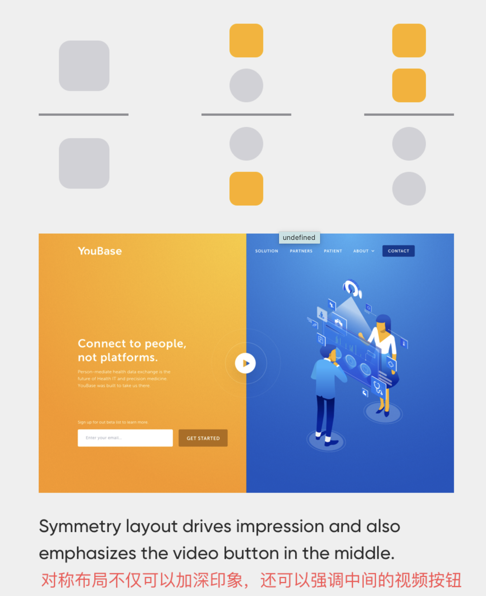 - 對稱律:對稱布局能帶來穩(wěn)定、秩序的視覺感受,是打造和諧界面的 “安全法則”。我們在 banner 設計、產(chǎn)品核心功能展示區(qū)常運用對稱布局,同時通過突出 CTA 按鈕、差異化標題打破單調(diào),既讓用戶感到舒適,又能引導核心操作。