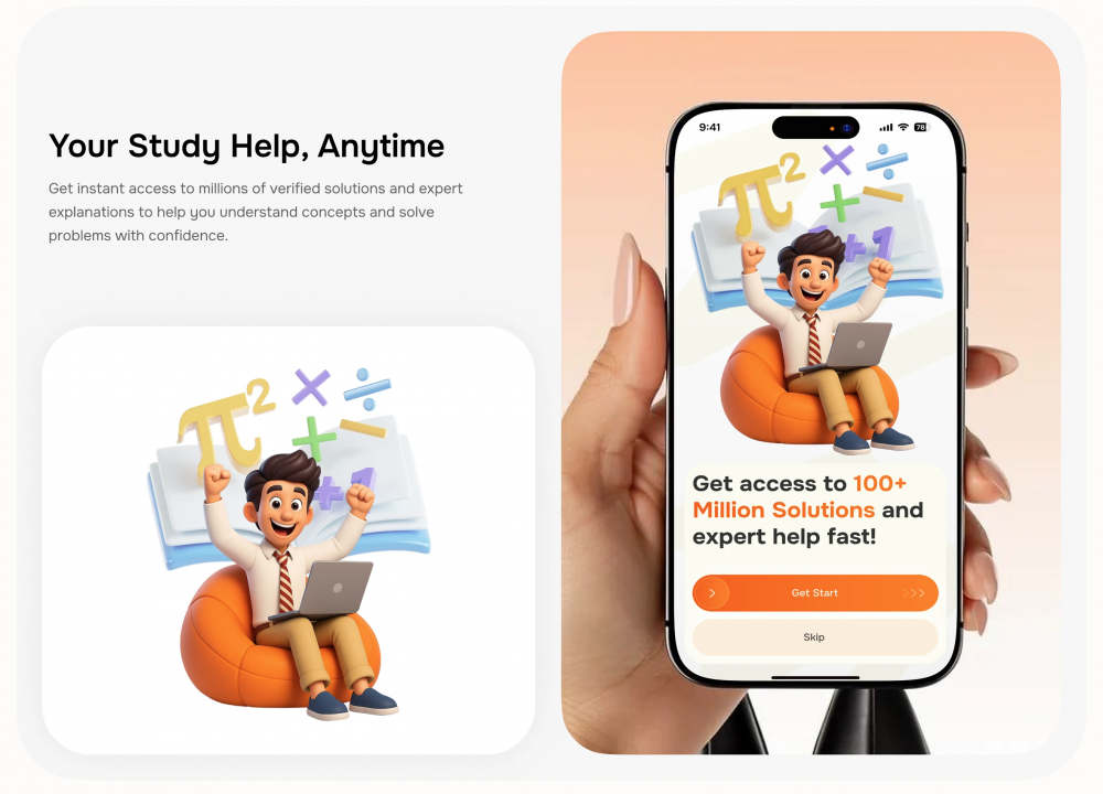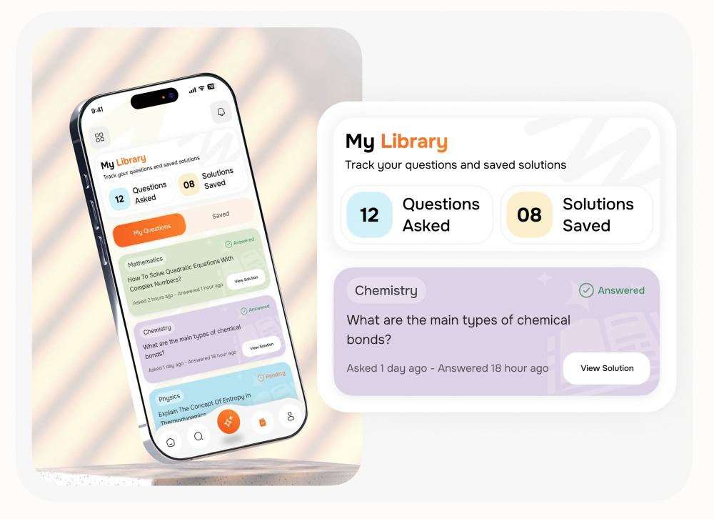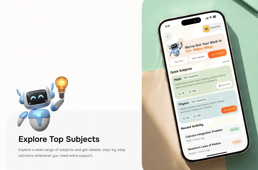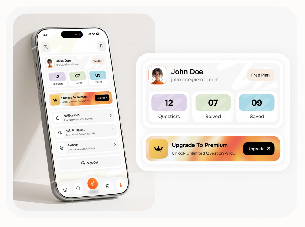色彩體系以柔和暖橙搭配干凈白色為主,局部點綴低飽和亮色區(qū)分學科與功能模塊,視覺上清新治愈,有效緩解長時間使用的視覺疲勞。界面布局遵循移動端通用交互習慣,底部固定核心導航欄,首頁核心功能入口直觀展示,提問、搜題、文庫、個人中心等高頻功能一鍵可達,操作路徑極簡,新手也能快速上手。