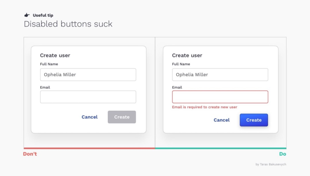 建議:盡量避免使用禁用按鈕。更好的做法是始終啟用按鈕。如果用戶遺漏了必填信息,只需在相應空白字段下方給出明確提示,或高亮顯示錯誤項即可。
