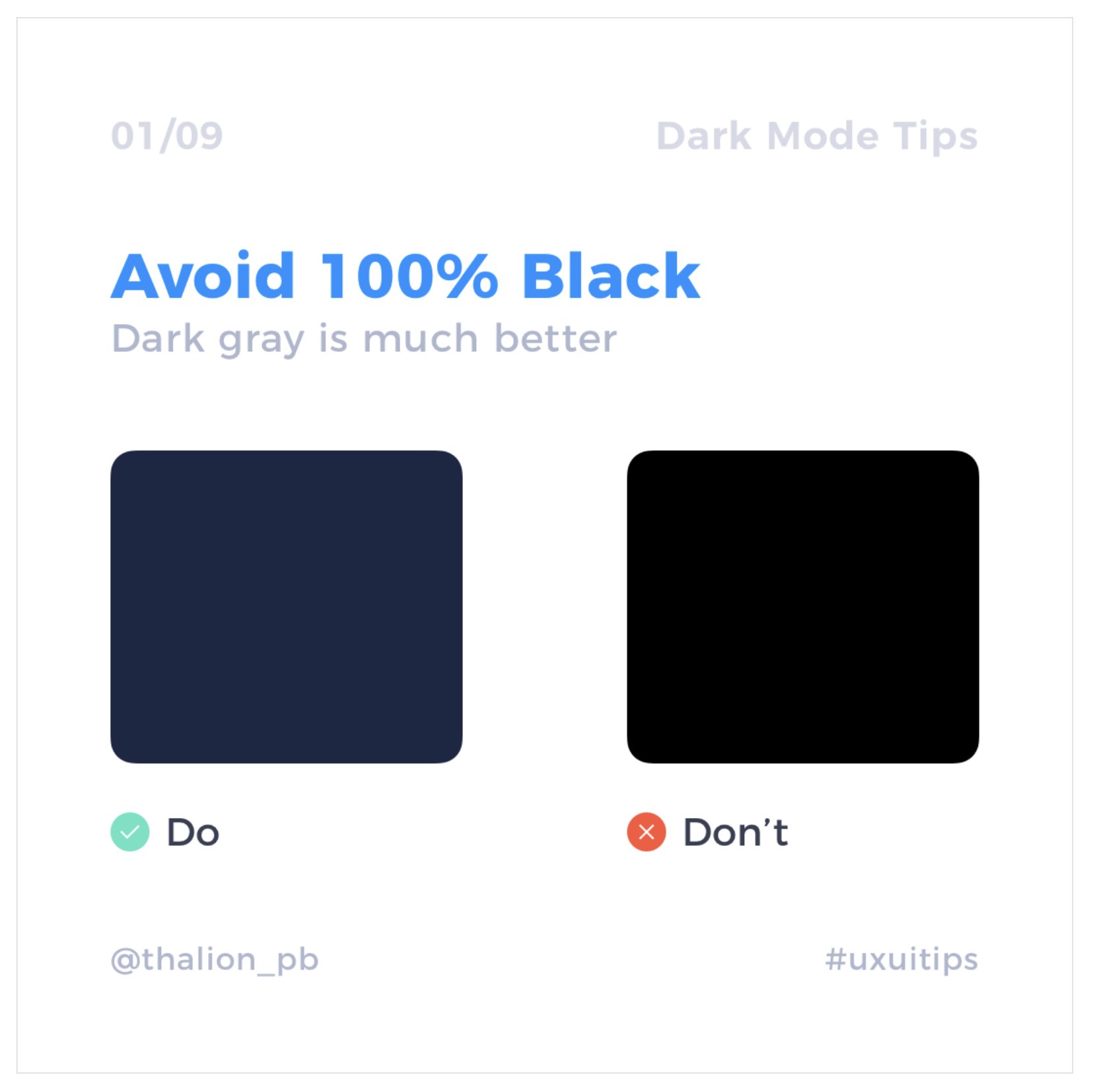 直接用 #000000 純黑會丟失層次、壓抑視覺,也不符合主流設計語言。