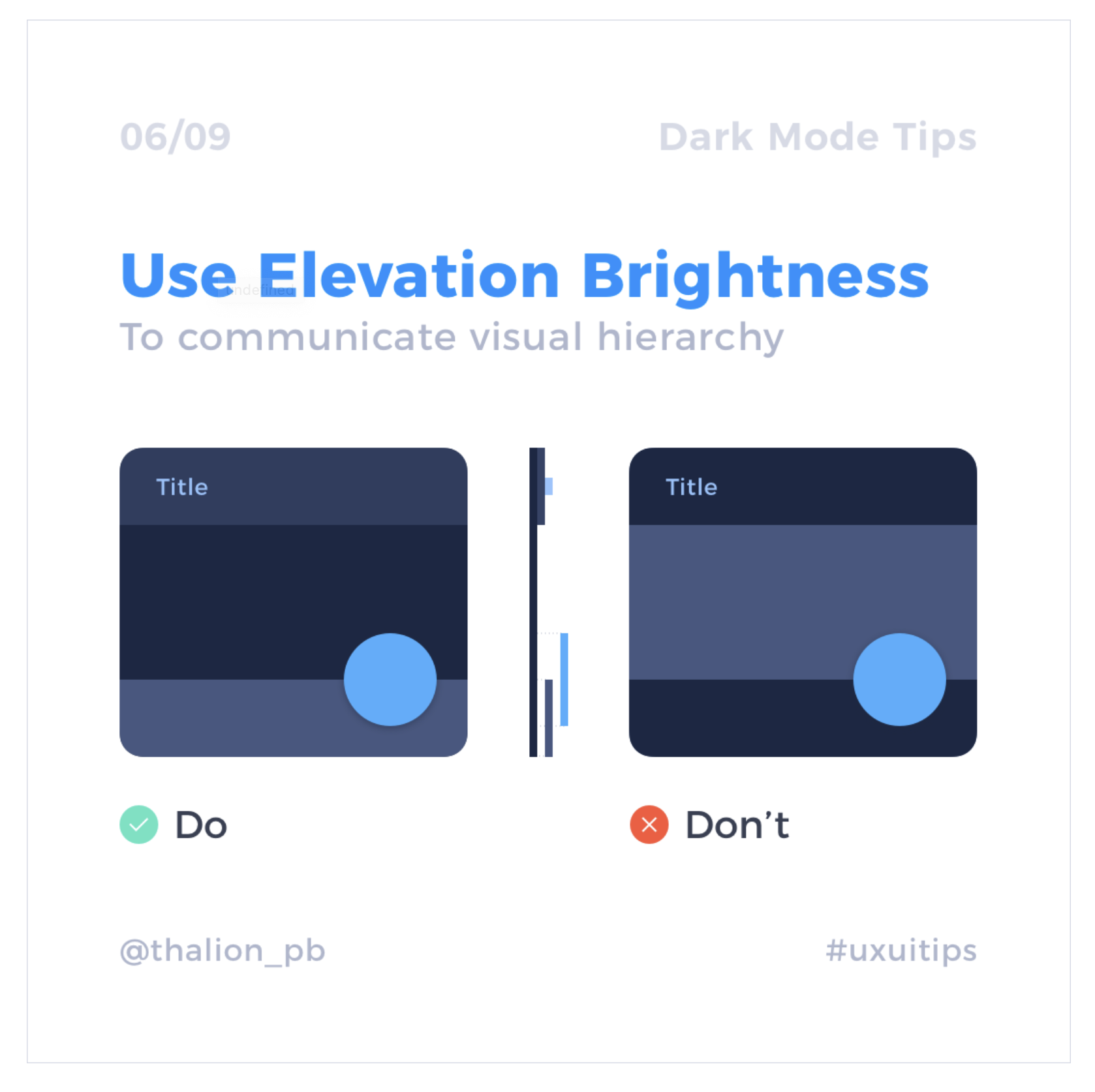 淺色模式常用陰影表達深度,但暗黑模式中陰影幾乎不可見。