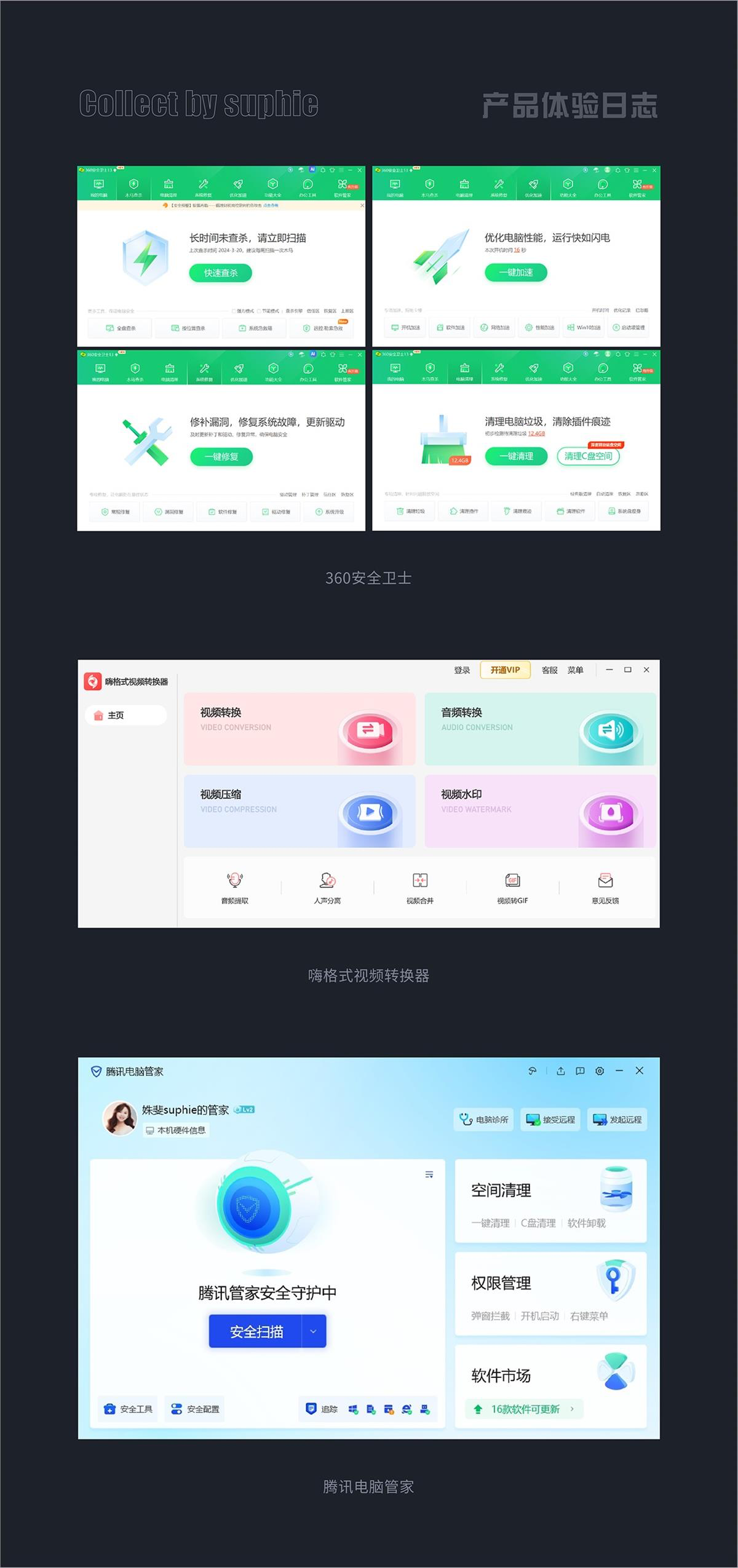 - 360 安全衛(wèi)士、騰訊電腦管家、嗨格式視頻轉(zhuǎn)換器的功能圖標,均采用大眾熟知的圖形設(shè)計,精準匹配業(yè)務(wù)場景,美觀且易識別。