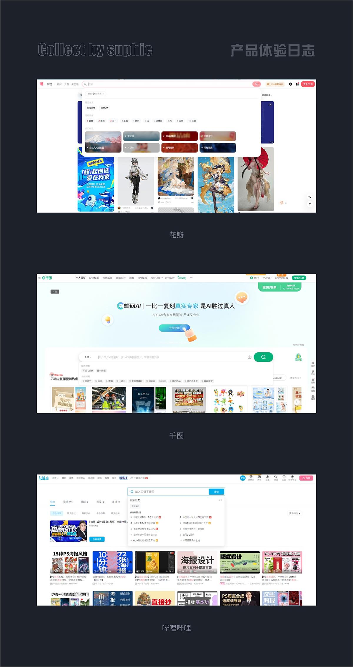 - 花瓣、千圖、嗶哩嗶哩的搜索欄,自動保存歷史搜索記錄,用戶無需重復(fù)輸入,一鍵選擇即可快速搜索。