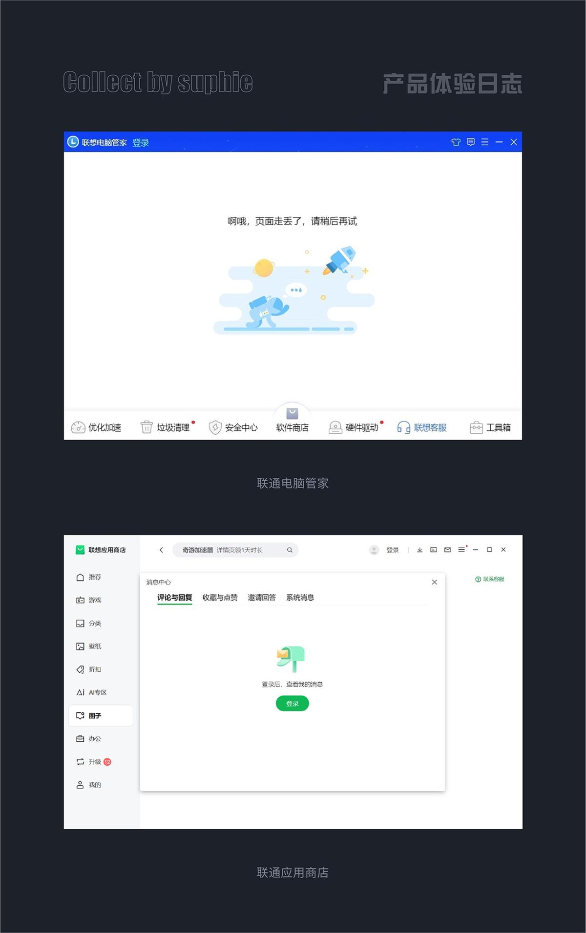 - 聯(lián)想電腦管家客服頁面異常時,給出清晰的文字提示 + 趣味插畫,既說明問題又安撫情緒。